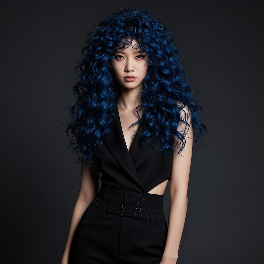 Photograph of an Asian woman with long, voluminous, curly blue hair against a dark background. She has a fair complexion and a neutral expression. She wears a sleeveless, deep V-neck black top that reveals a hint of her cleavage and high-waisted black pants with a lace-up detail at the waist. Her makeup is subtle, emphasizing her natural features. The lighting highlights the texture of her hair and the fabric of her clothing, creating a stark contrast with the dark background. The overall style is modern and edgy, with a focus on bold hair color and minimalist clothing.