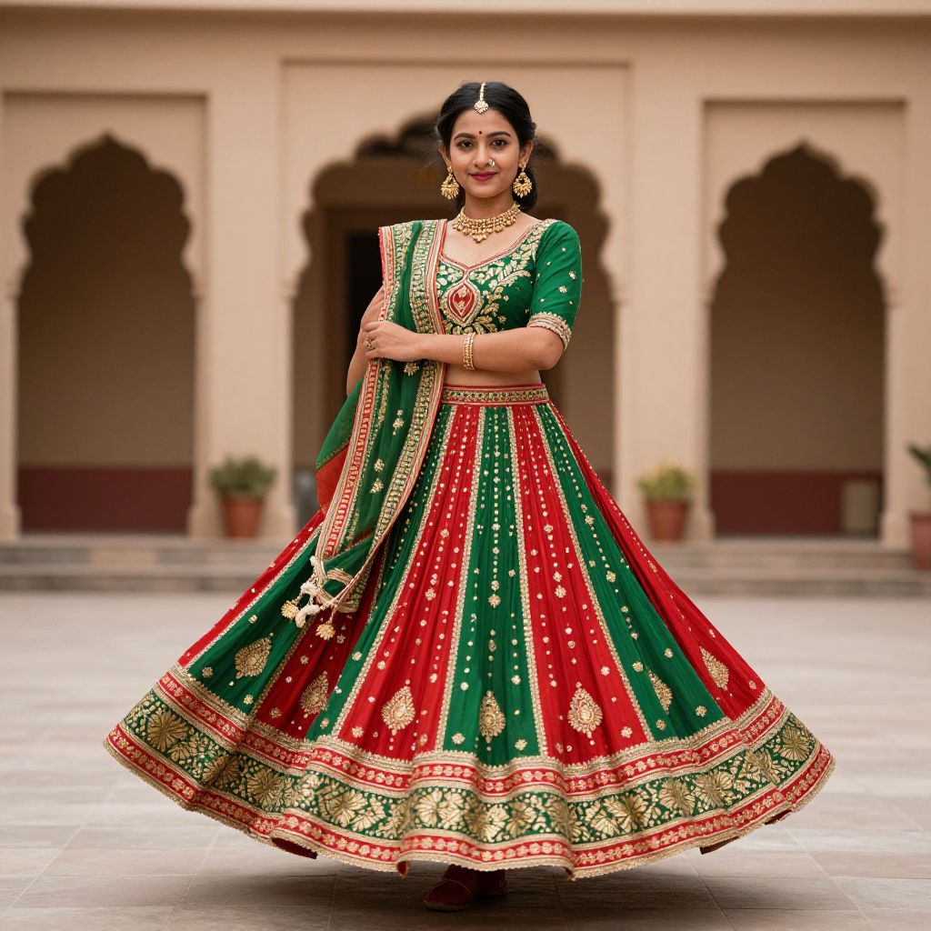 Dandiya dance dress, a woman in a green and red lehen with a green blouse