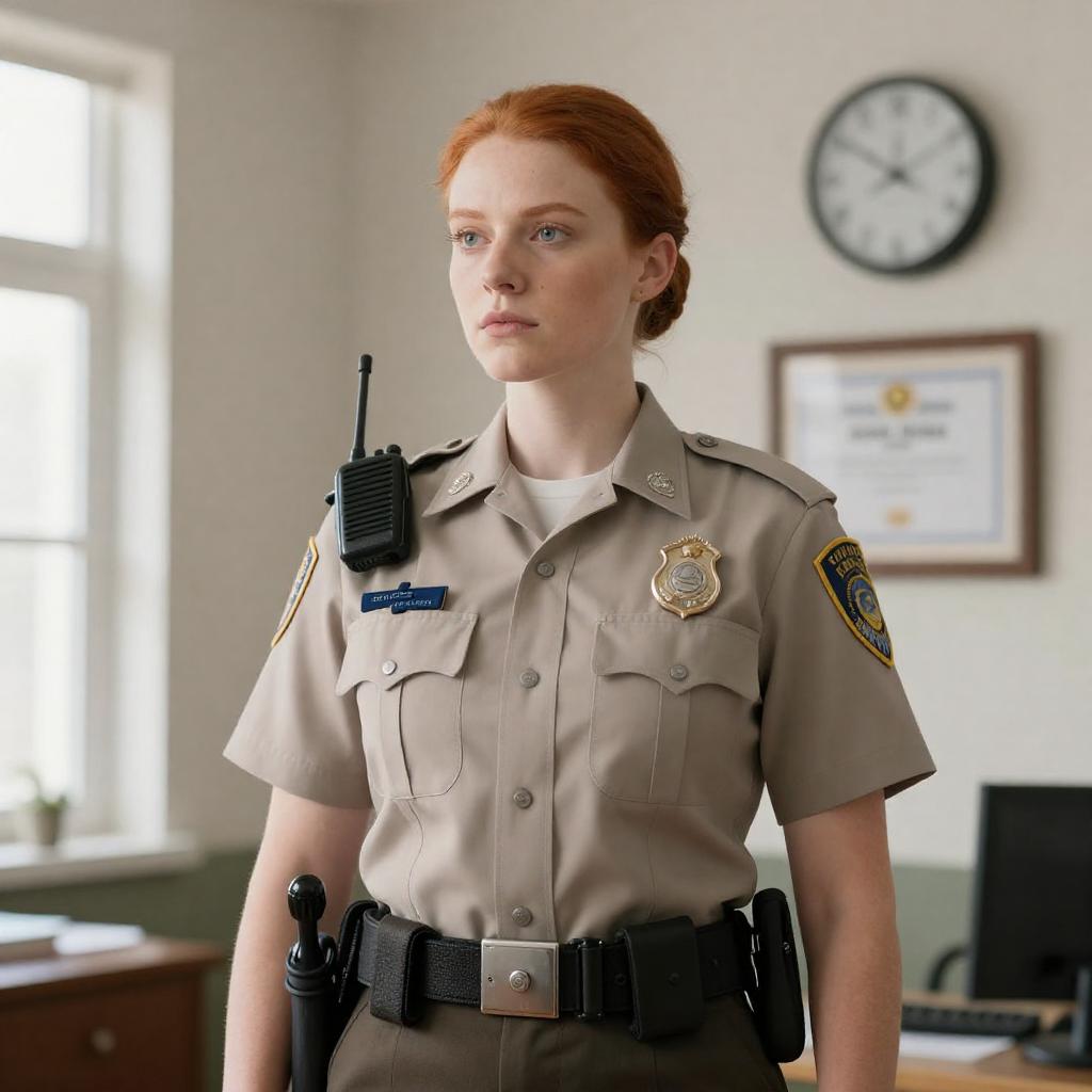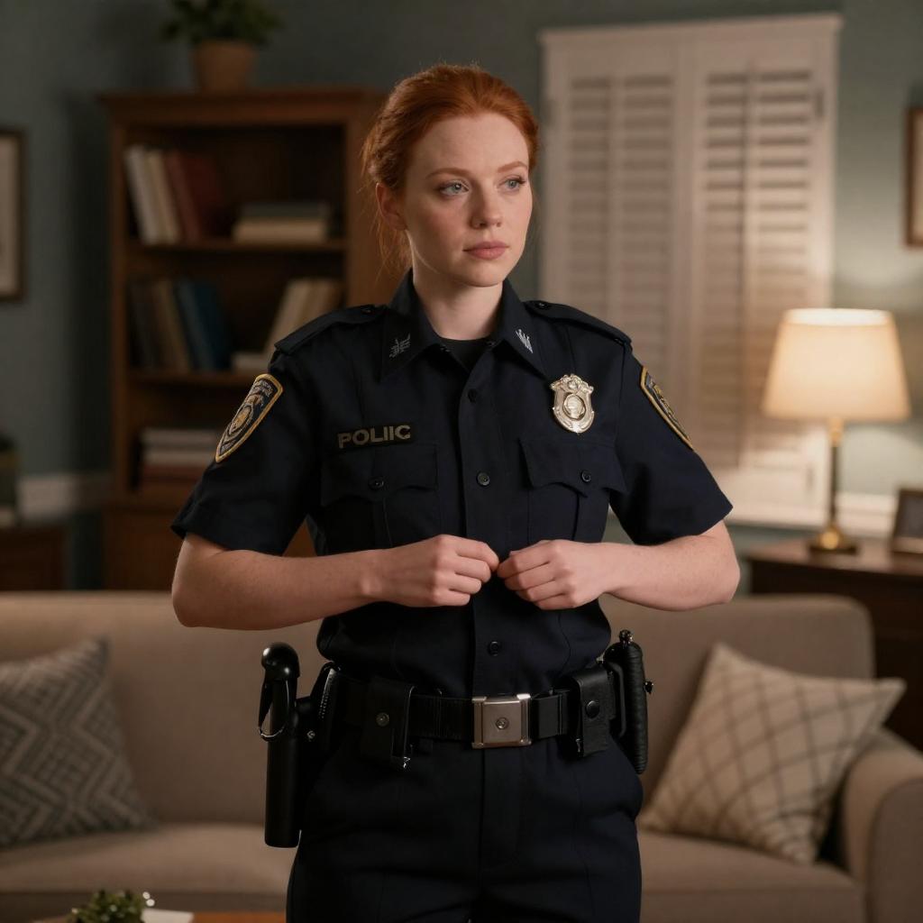 Photograph of a blonde woman with wavy hair, wearing a black police uniform and cap with a gold badge, looking surprised. She is in front of a white wall with a large red lips painting. The background includes a blurred chair and a partial view of a door.