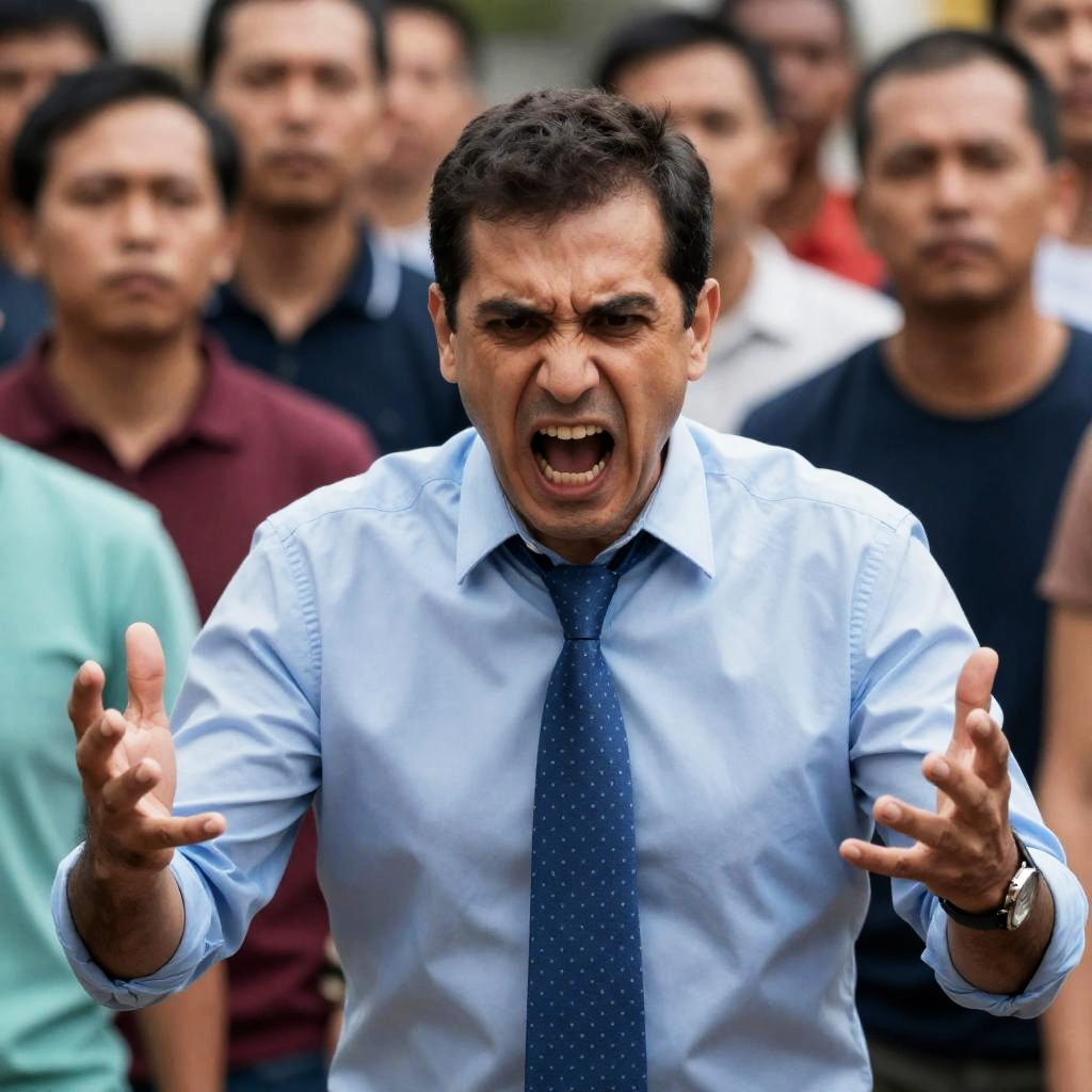 Photograph of two people in a dimly lit hallway. A middle-aged man with short curly hair in a yellow striped shirt stands close to a woman with short dark hair in a black floral shirt, facing him. Man looks serious, woman's back is to camera. Blurred clothes on left, doorframe on right.