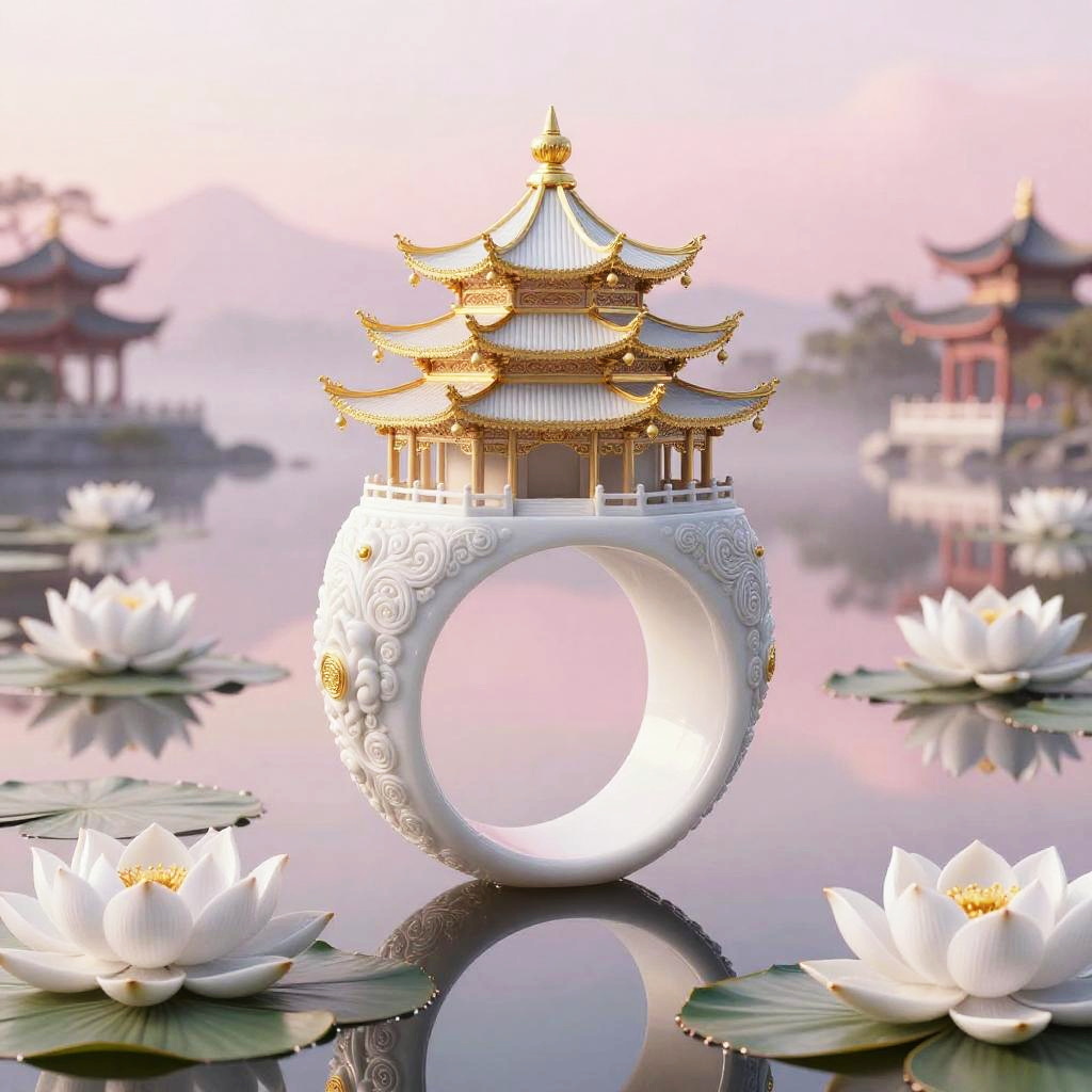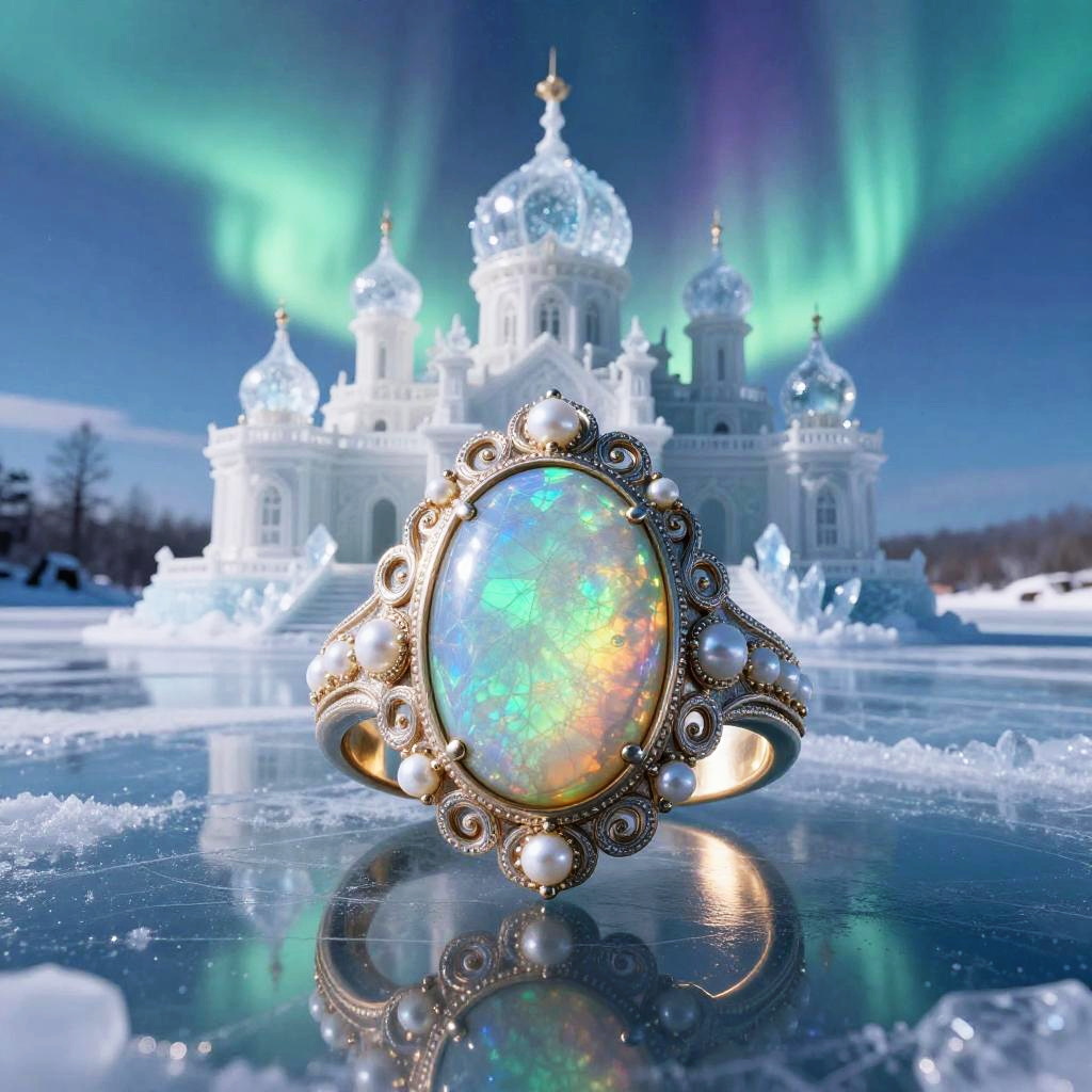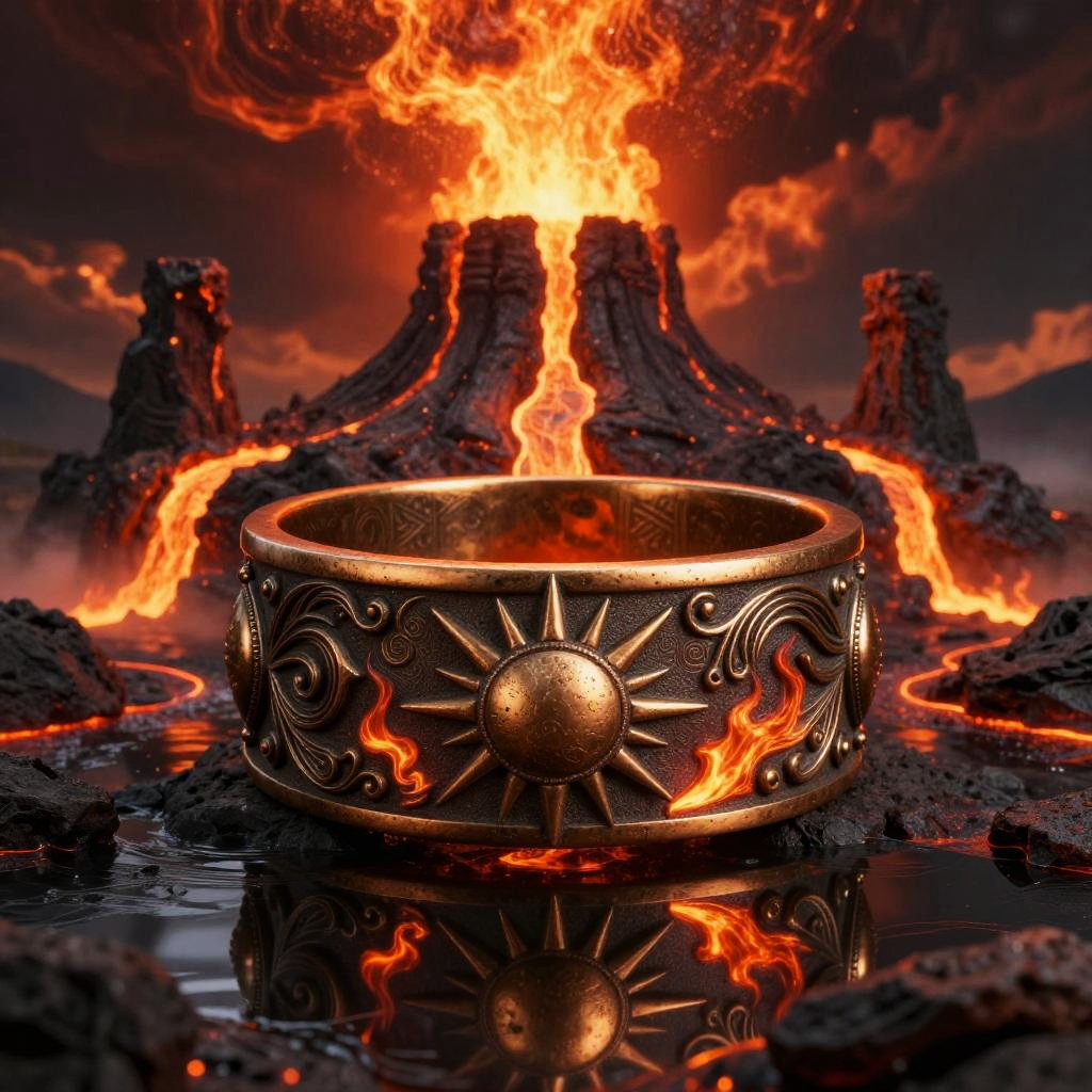 A digital fantasy composition featuring massive obsidian circular ring with obsidian studs and etchings surrounding gigantic fortress made of black crystal and sharp facets. Set within perched on jagged cliffs overlooking a glassy chasm framed by stormy skies, with perfect reflections, ornate filigree, metallic shimmer, and a surreal dreamlike mood. Intricate patterns, soft volumetric light, high detail, balanced symmetry, subtle haze, harmonious color palette, ultra crisp yet painterly finish.