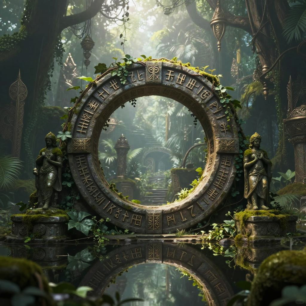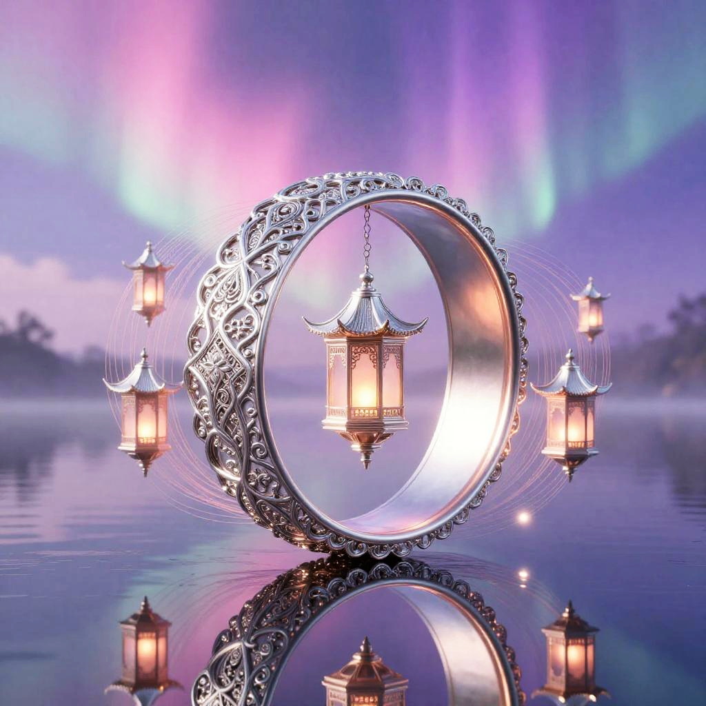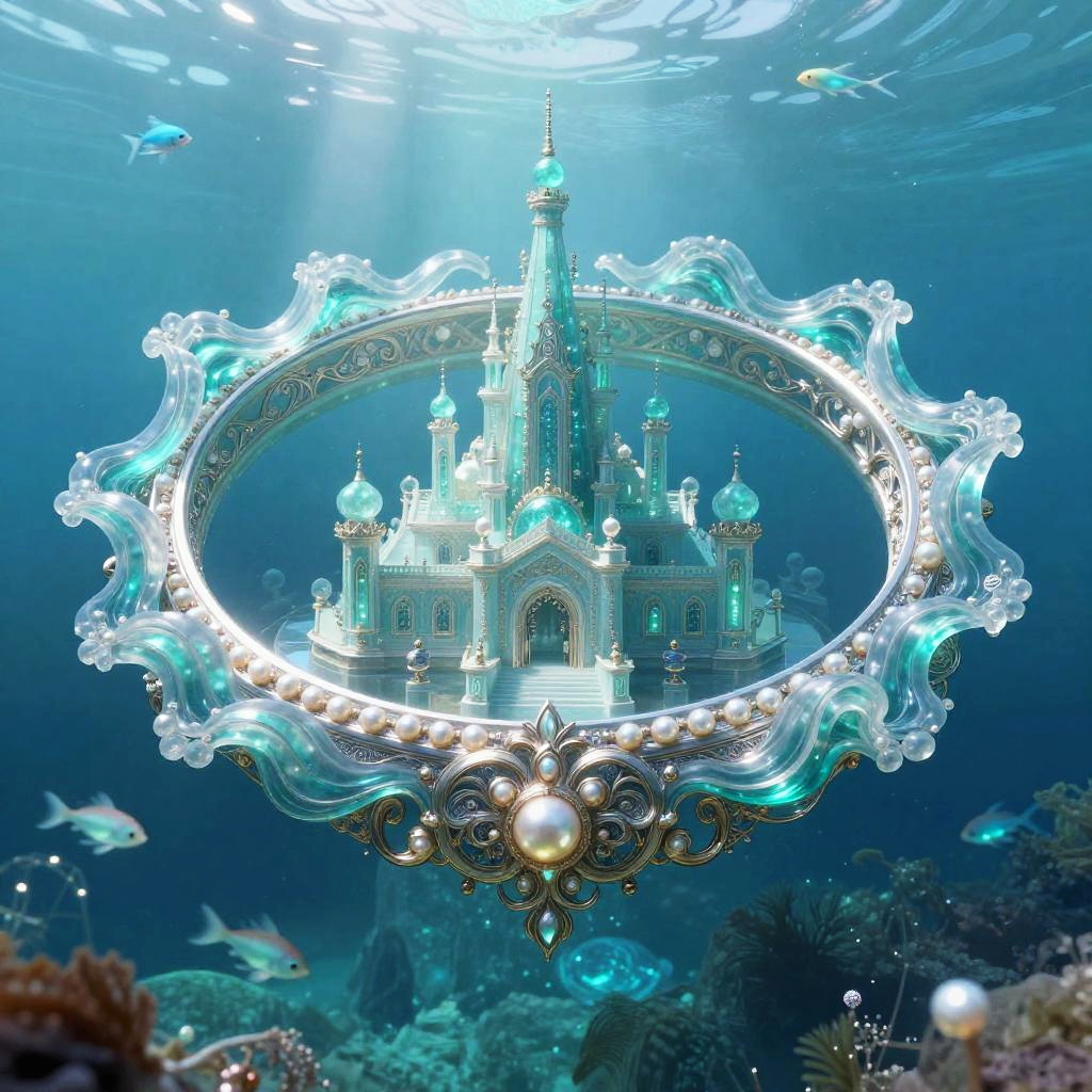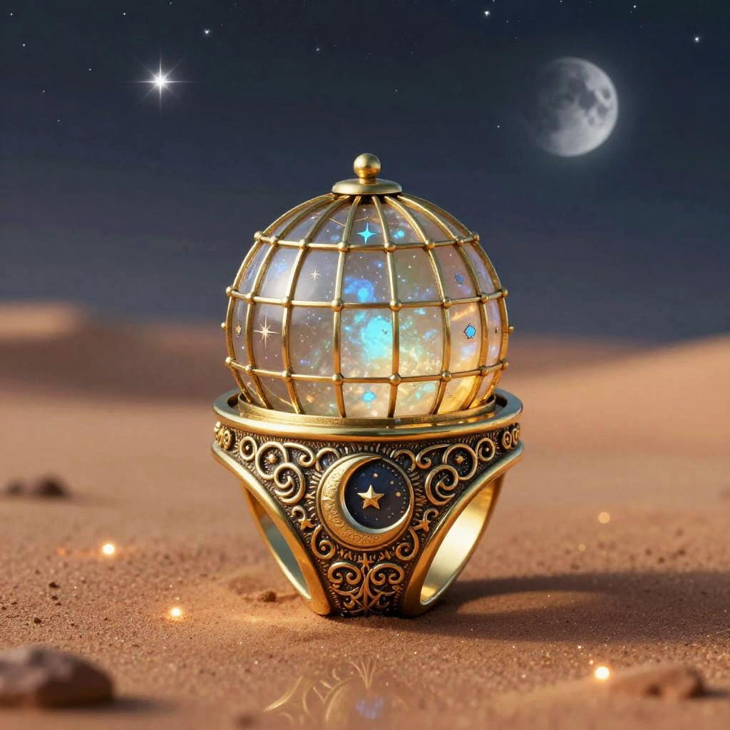A digital fantasy composition featuring massive obsidian circular ring with obsidian studs and etchings surrounding gigantic fortress made of black crystal and sharp facets. Set within perched on jagged cliffs overlooking a glassy chasm framed by stormy skies, with perfect reflections, ornate filigree, metallic shimmer, and a surreal dreamlike mood. Intricate patterns, soft volumetric light, high detail, balanced symmetry, subtle haze, harmonious color palette, ultra crisp yet painterly finish.