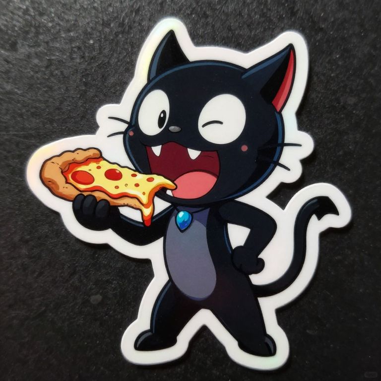 Holographic Sticker a cartoon hellcat using its tail to hold and eat a slice of pizza. Big Mouth Cartoon Style –uplight –ar 3:2,