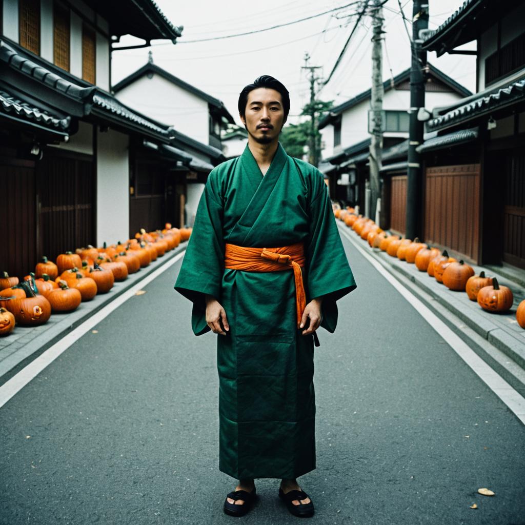 Photograph of an Asian man in a navy blue kimono with a red sash, black headband, standing on a quiet Japanese street with traditional