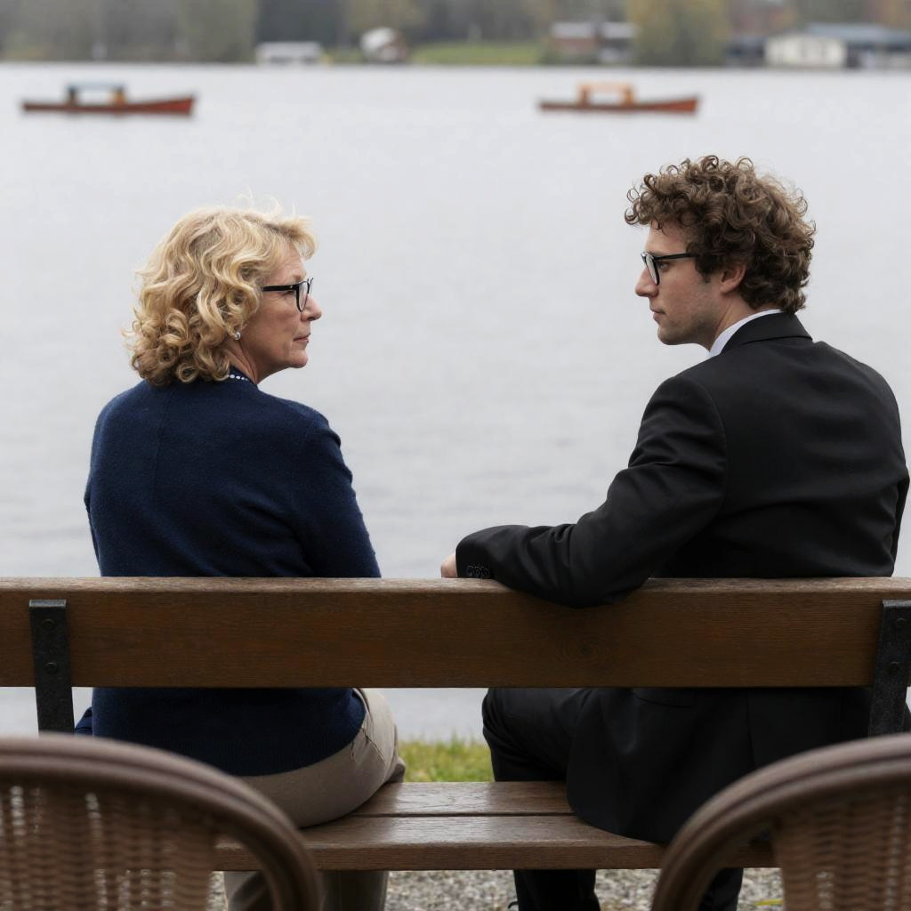 Photograph of two people. Young man with dark hair, glasses, white shirt, and black vest, looks down at his hands. Older woman with curly blonde hair, glasses, white shirt, black vest, rests chin on hand, looks at young man. Dimly lit background. Both wear serious expressions.