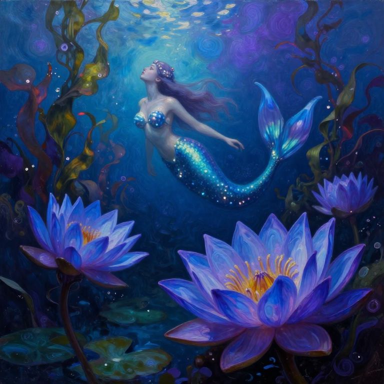 Picture an oil painting style evoking the rich textures and lighting of Rembrandt's works, portraying a mesmerizing mermaid lost in thought. Surrounded by an ancient, mystical forest, she sits beneath a canopy of glowing flora that dances with candlelight, casting intricate shadows on her face. This enchanting aerial view captures a serene moment of introspection, as the mermaid's gaze beckons viewers into her magical realm where reality and fantasy merge in a captivating blend of light and color.