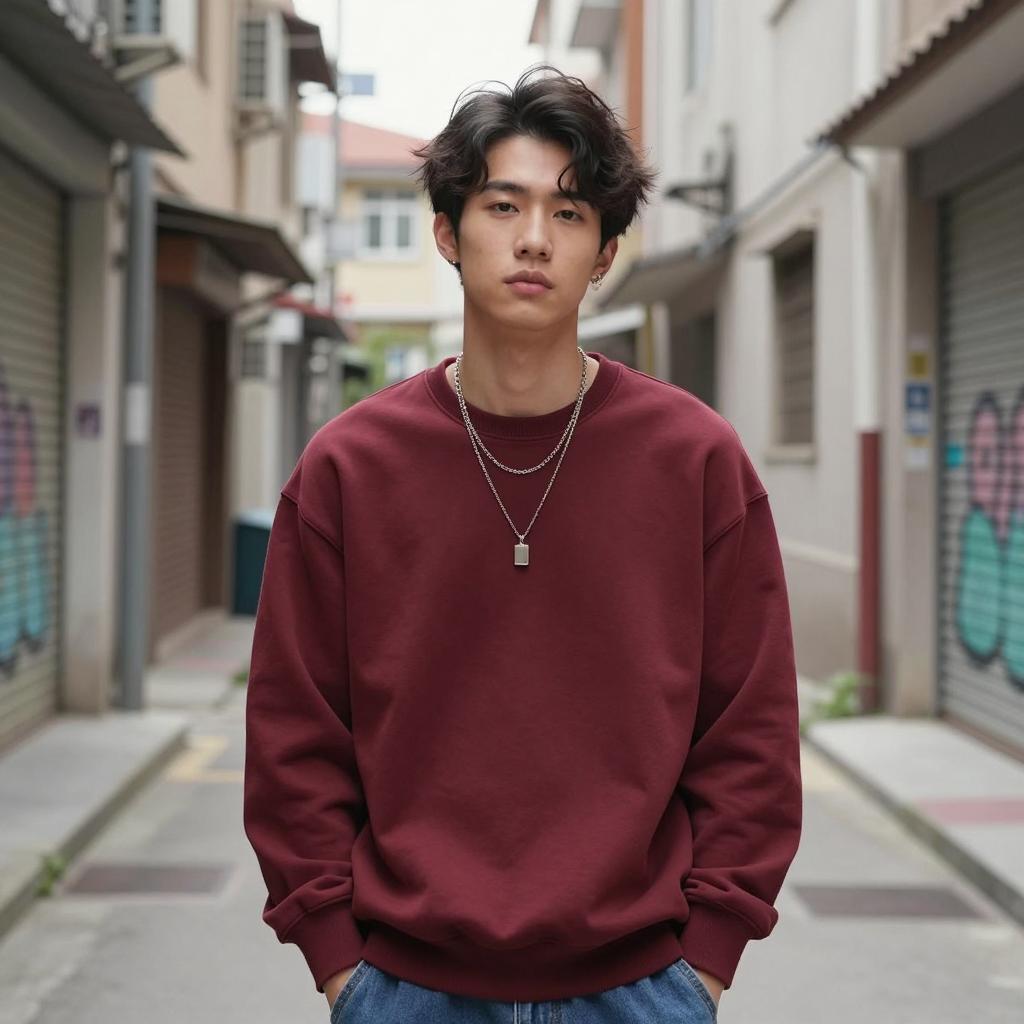 Kung styles, photograph of young Asian man, standing in narrow alleyway, wearing maroon sweatshirt, blue jeans, layered necklaces, casual hairstyle, slightly tousled, serious expression, urban street style, ured background with graffiti and weathered buildings, natural lighting, daytime, realistic style