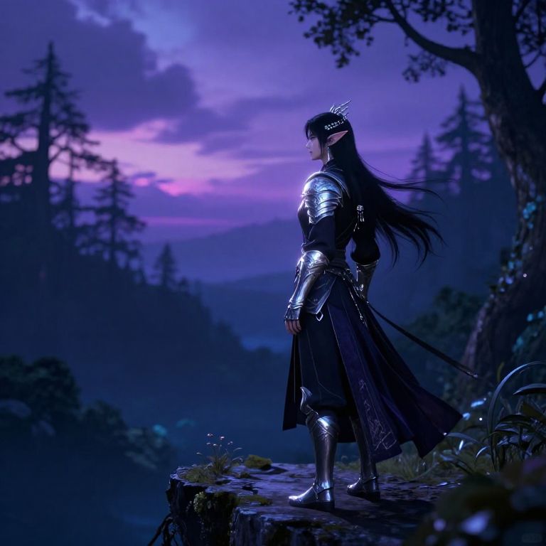 Fantasy scene featuring a pale with black hair elf standing on a cliff overlooking a dark enchanted forest, silver accessories and intricate armor, soft glow around the figure, vibrant twilight sky with purples and blues, magical and serene ambiance.