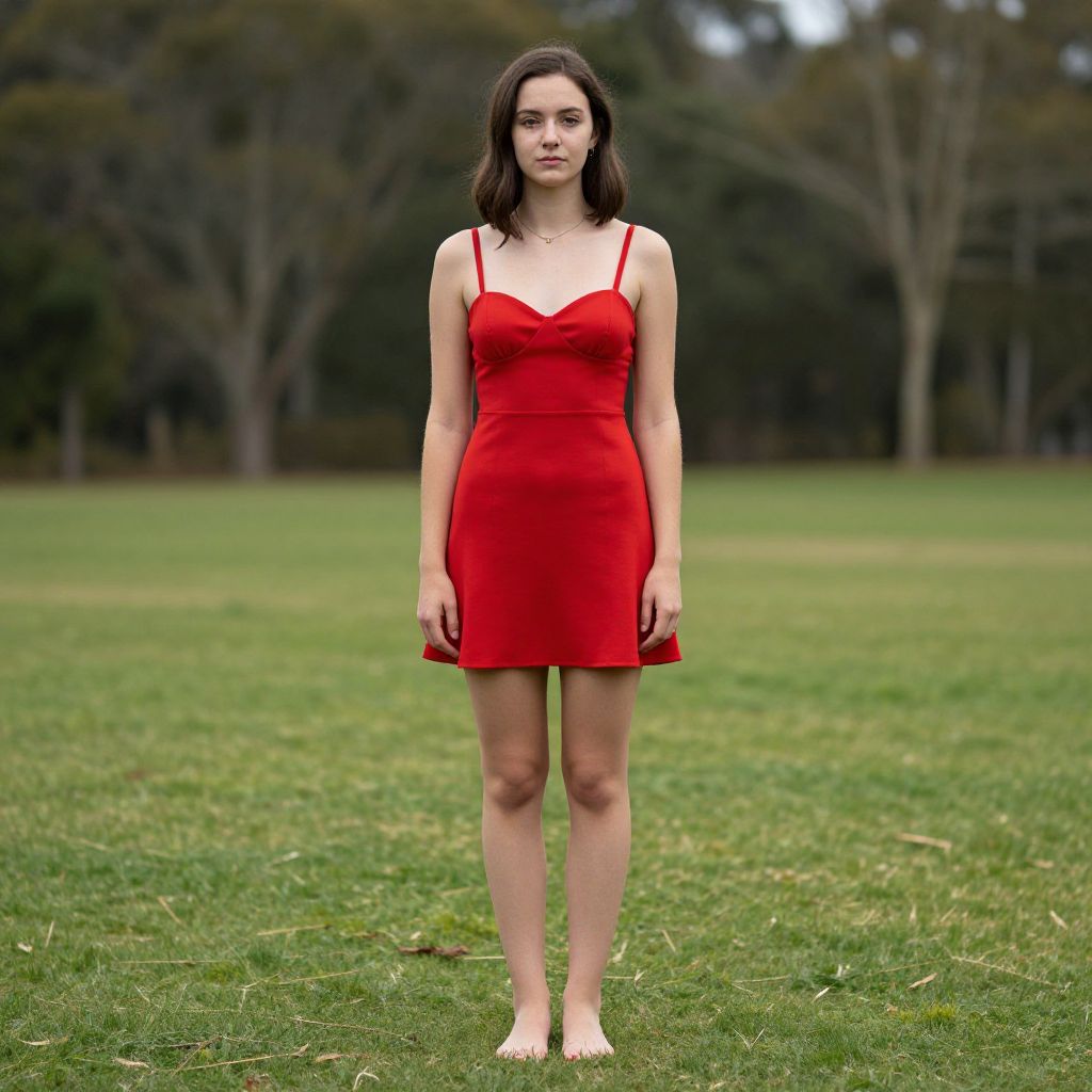 "australian open dress, solo, 1girl, realistic, dress, photorealistic, red dress, barefoot, parody, standing Realistic photo of casual sexy person with pretty face"