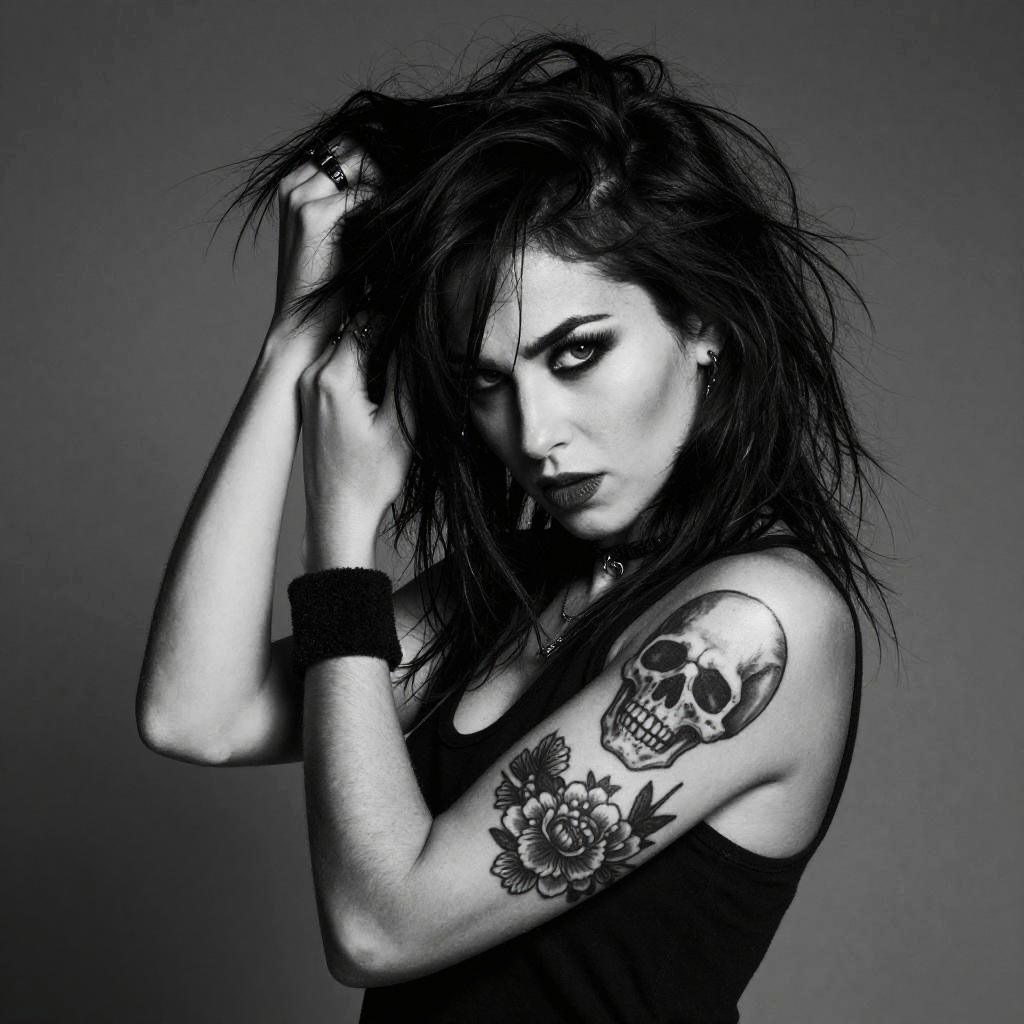 Black and white photograph of a punk-rock style woman with messy, dark hair and intense eyes. She's gripping her hair with one hand while the other arm, heavily tattooed with a detailed skull and floral design, rests across her chest. She's wearing a black sleeveless top and a dark wristband. The background is a gradient of grey. The image has a high-contrast, gritty feel.