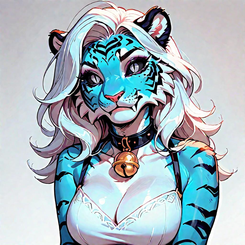 Score_9, score_8, score_8_up, score_7_up, score_6_up, score_5_up, score_4_up, rating_safe, source_furry, simple background, demon tiger hervy, anthro, wavy flowy white hair, gorgeous gray eyes with slit pupils and black sclera, makeup, large breasts, round bell collar, curvy figure, by oouna and by spottyjaguar and by snowskau