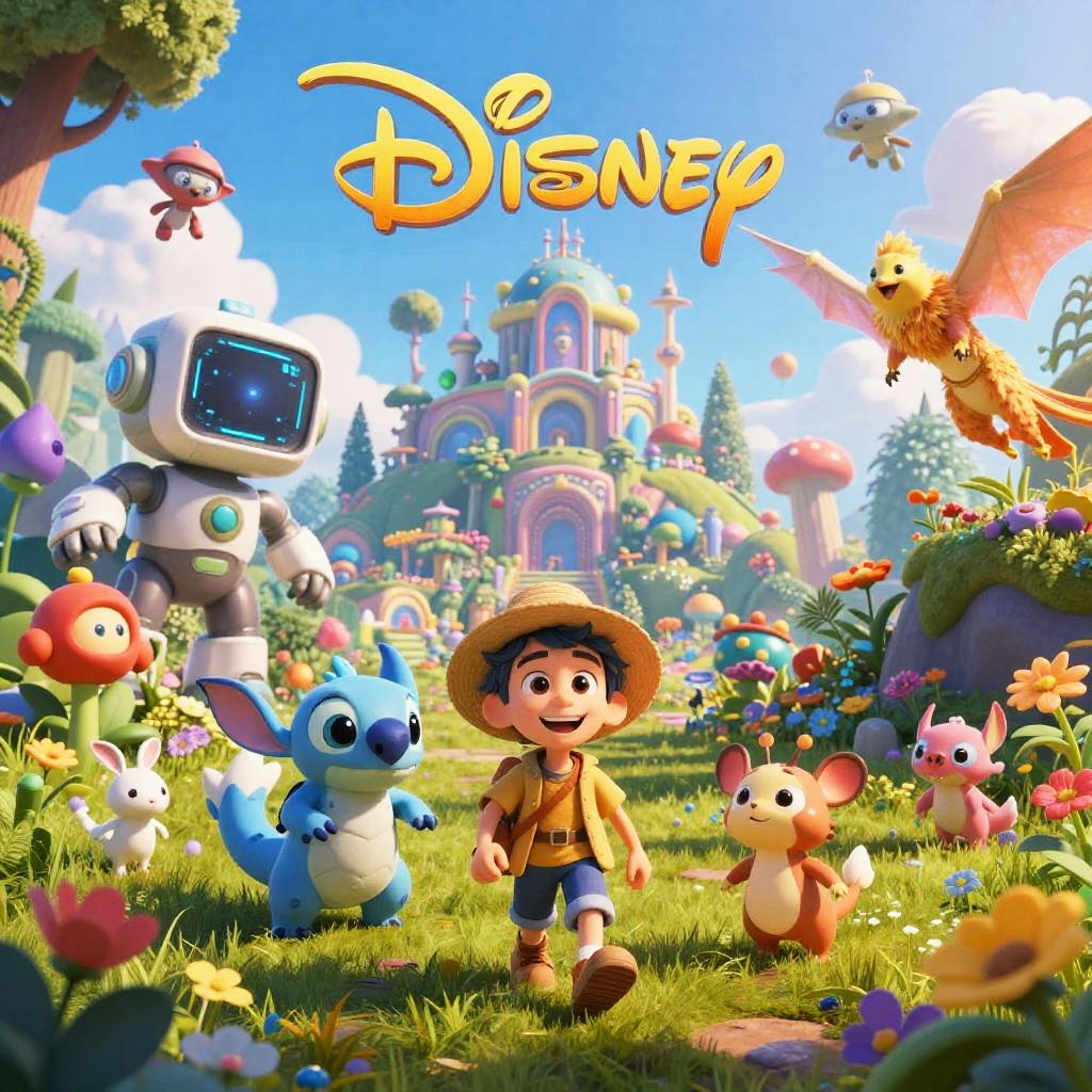 Disney AI movie poster depicting a magical journey through an enchanted virtual world, with AI companions and whimsical digital creatures, vibrant colors, and fantastical landscapes merging technology and fairy tale charm.