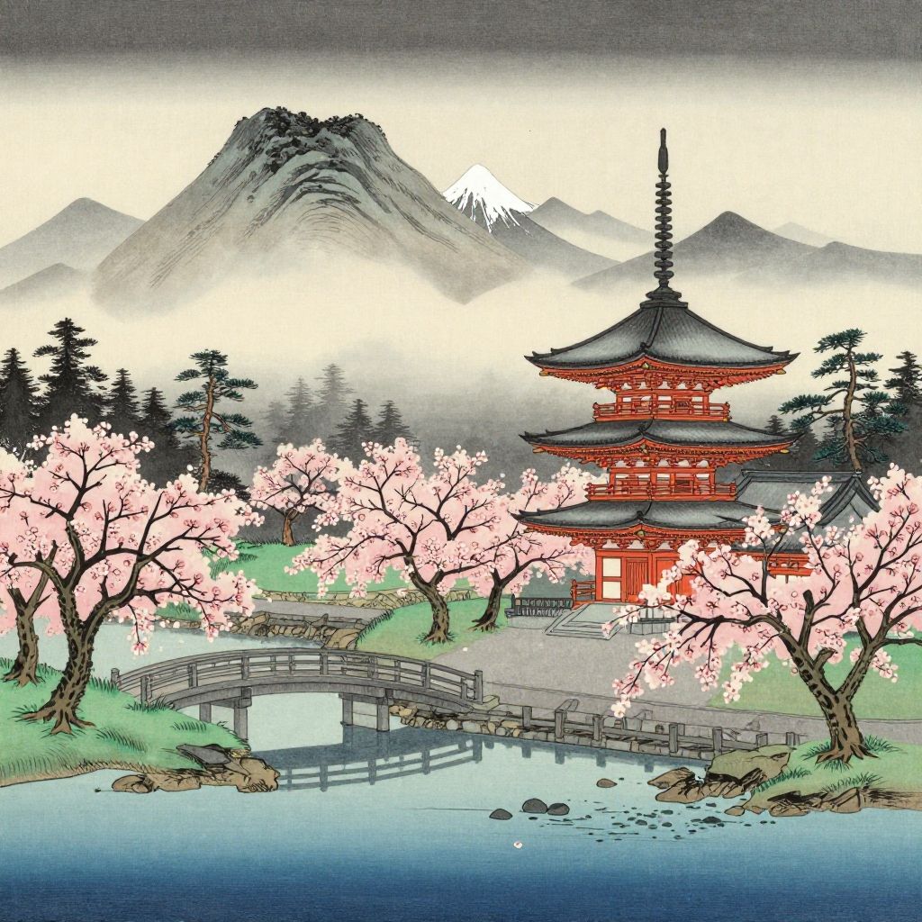 Ukiyo-e Pagoda in Misty Valley