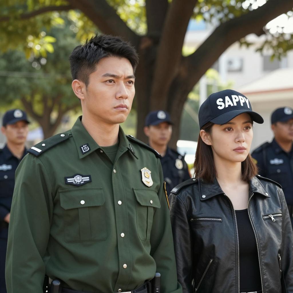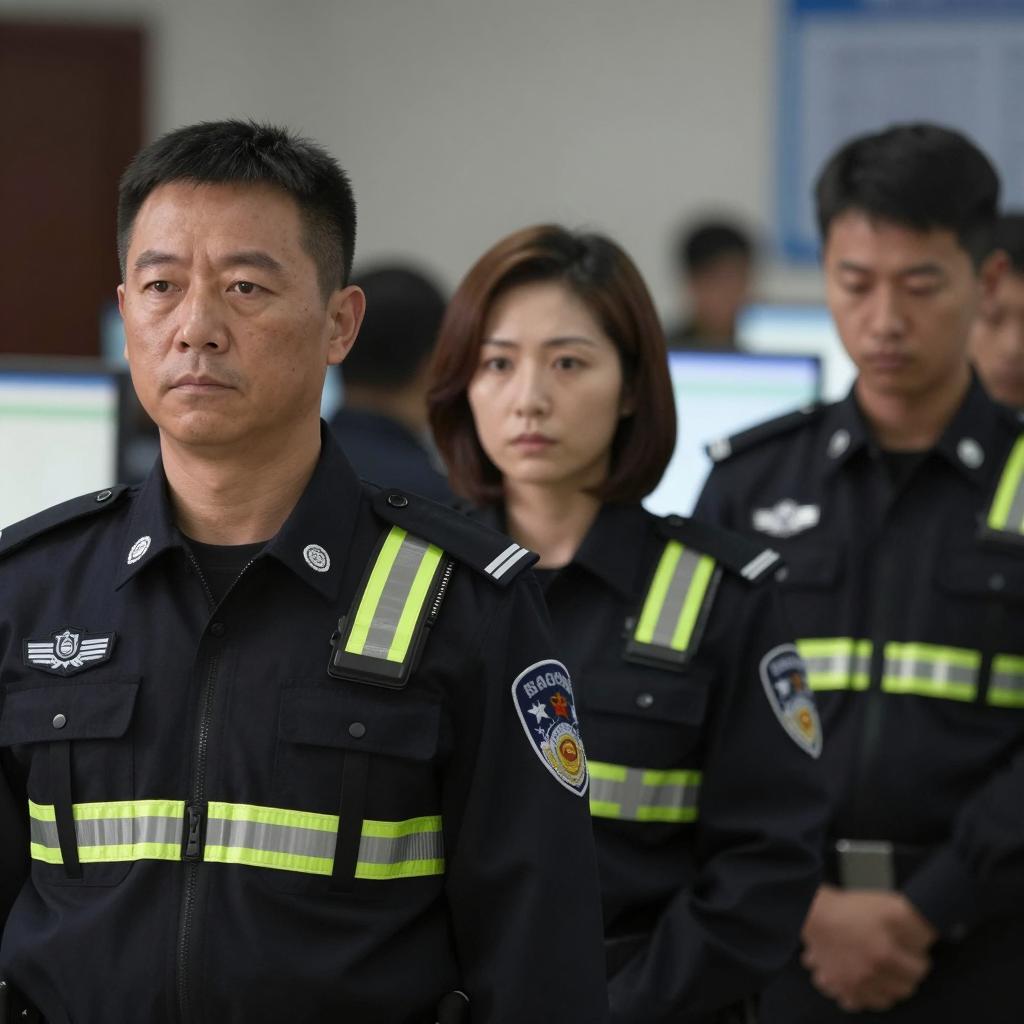 Three law enforcement officers in dark uniforms with reflective straps. Foreground: middle-aged man with short black hair, serious expression. Center: woman with shoulder-length brown hair, neutral expression. Right: younger man with short black hair, looking down. Background: dimly lit room with blurred figures and computer screens. All officers wear badges and rank insignia.