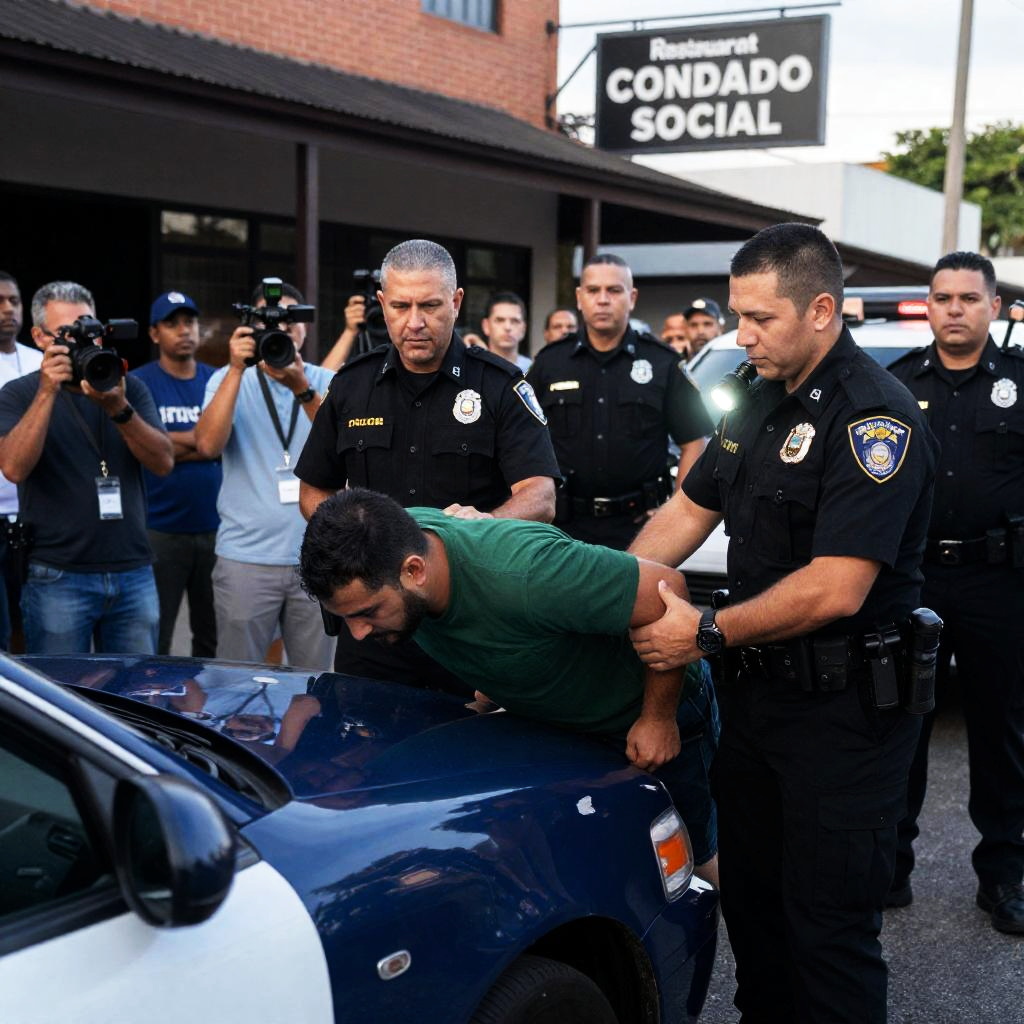 Photograph of a street arrest. Policemen in black uniforms, one with a flashlight, subduing a man in a green shirt. Blue police car in foreground. Crowd of reporters with cameras, intense expressions, behind police. Restaurant Condado Social sign in background. Brick and metal building.