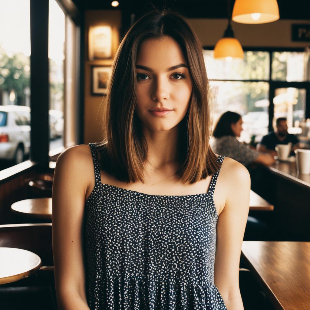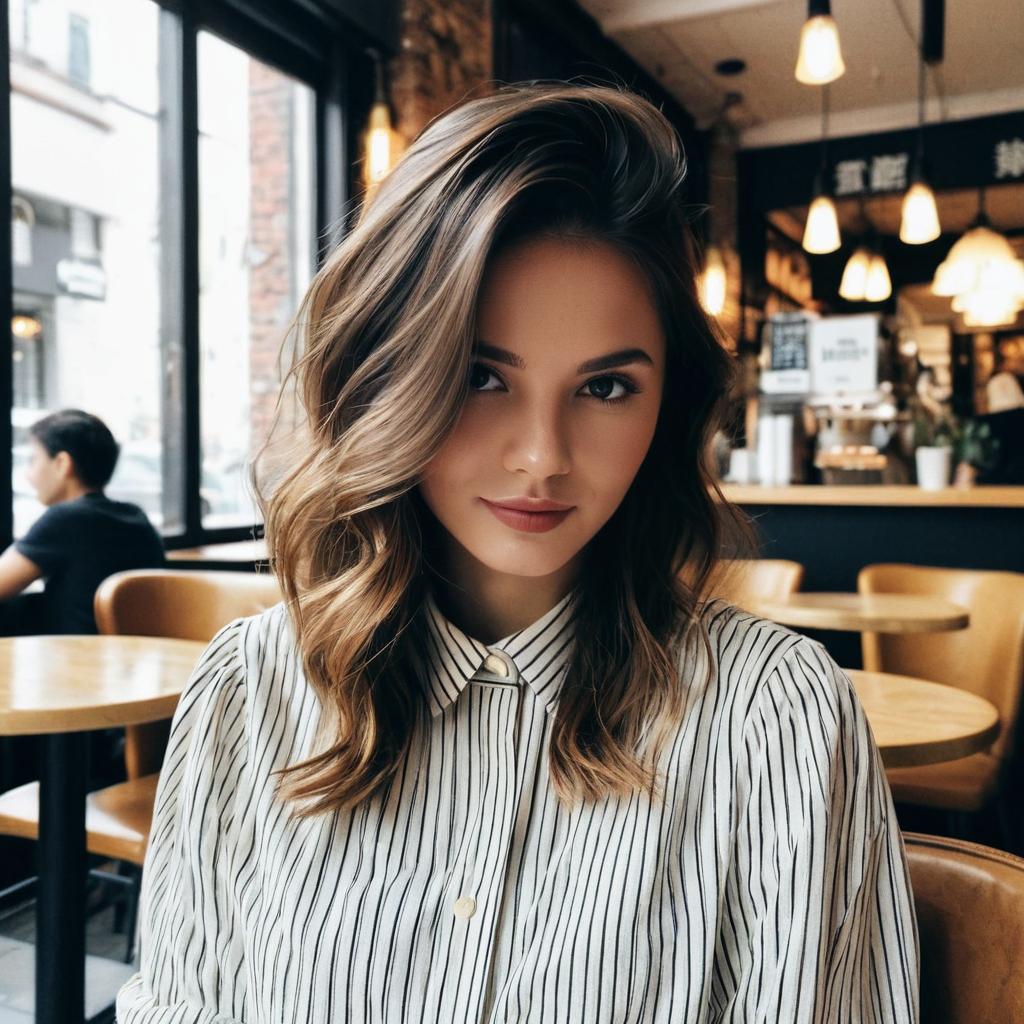 Hard Part hairstyle on young woman, wearing casual chic blouse, in urban cafe, captured in fashion editorial style with soft natural light.