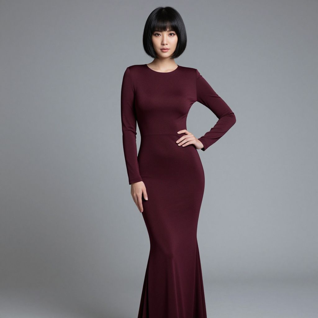 Photograph of a woman with a sleek, chin-length black bob haircut, standing confidently against a plain gray background. She's wearing a form-fitting, long-sleeved, deep burgundy gown that accentuates her hourglass figure. She stands with one hand on her hip and the other resting by her side, exuding elegance and poise. The lighting is even, highlighting the smooth texture of her dress.