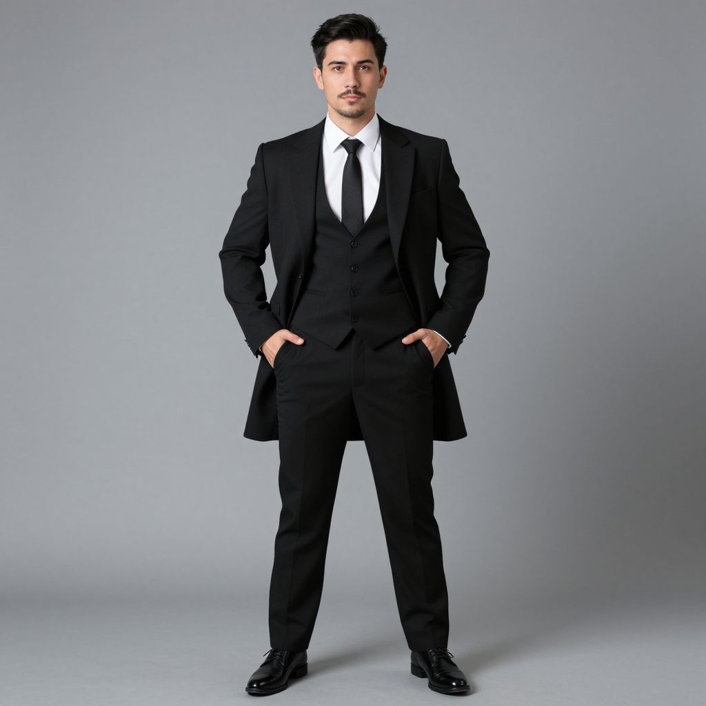 Photograph of a young man with short, dark hair and a light beard, standing confidently against a plain gray background. He is wearing a black three-piece suit with a white dress shirt and black tie, and his hands are casually placed in his pants pockets. He has a fair skin tone and a serious expression. His black leather shoes are polished and shiny. The suit is well-fitted, highlighting his slender build. The lighting is even, eliminating any shadows, and the overall style is formal and sophisticated.