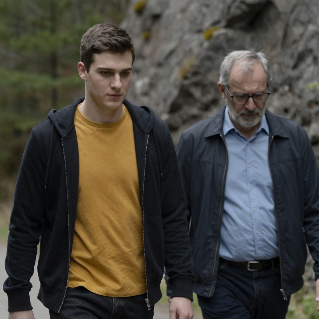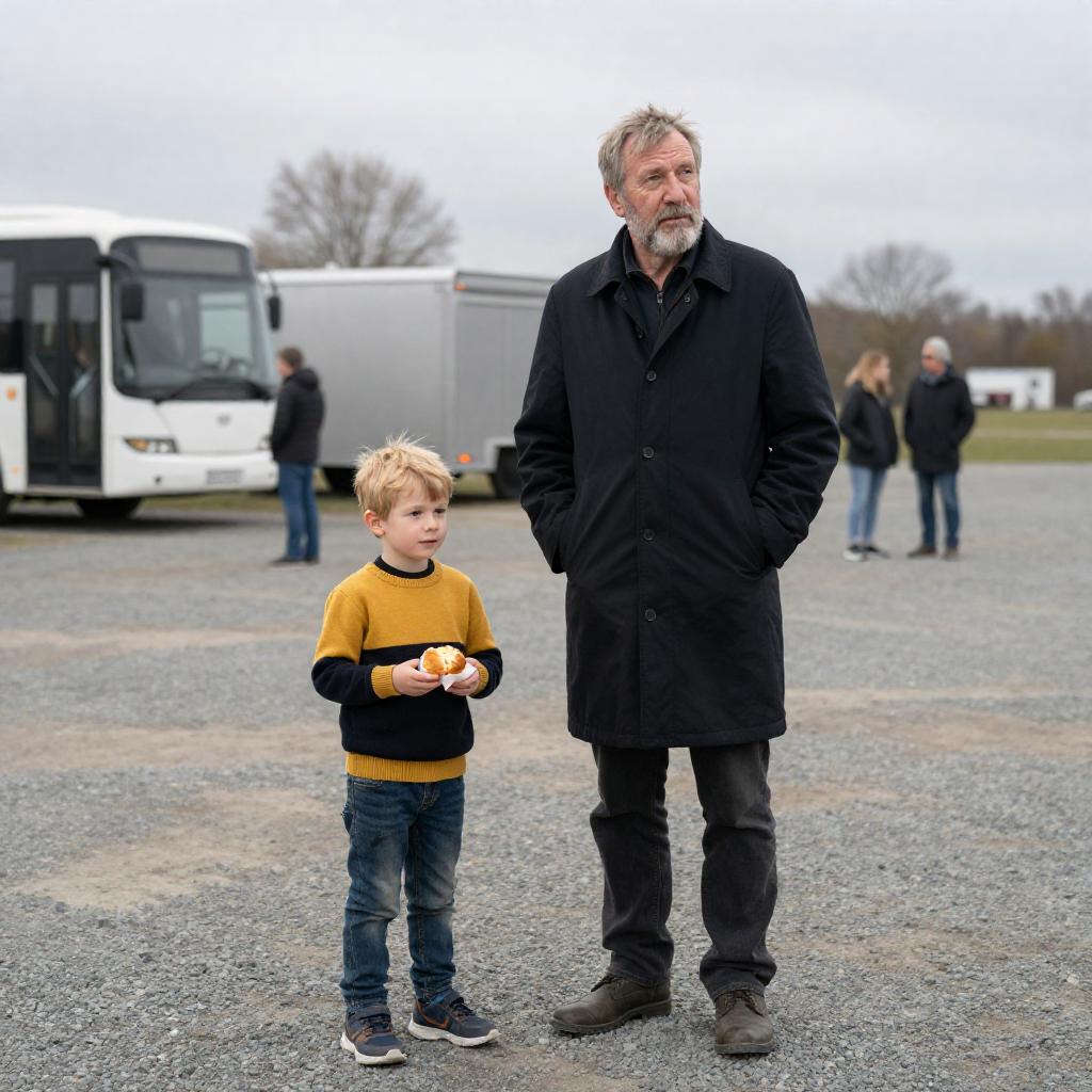 Photograph of an older man with a beard and a young boy standing on a gravel lot. The man wears a long black coat and looks to the right. The boy, with blond hair, wears a yellow and black sweater, holding a pastry. Background includes a bus, a trailer, and several people. Overcast sky, trees in distance.