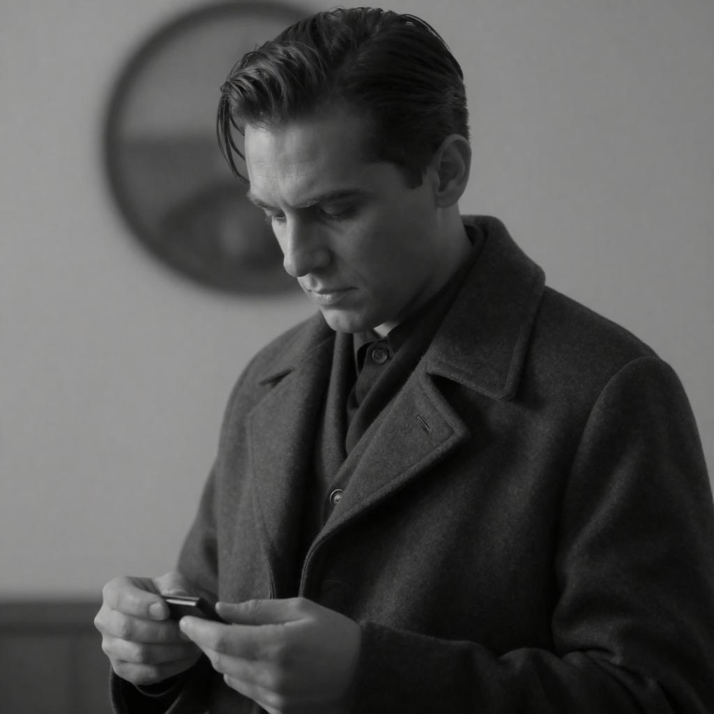 Black-and-white photograph of a serious-looking man with dark, slicked-back hair, wearing a dark coat. He holds a small object in his right hand. Background includes a blurry circular object on the wall. Man's face is slightly shadowed.