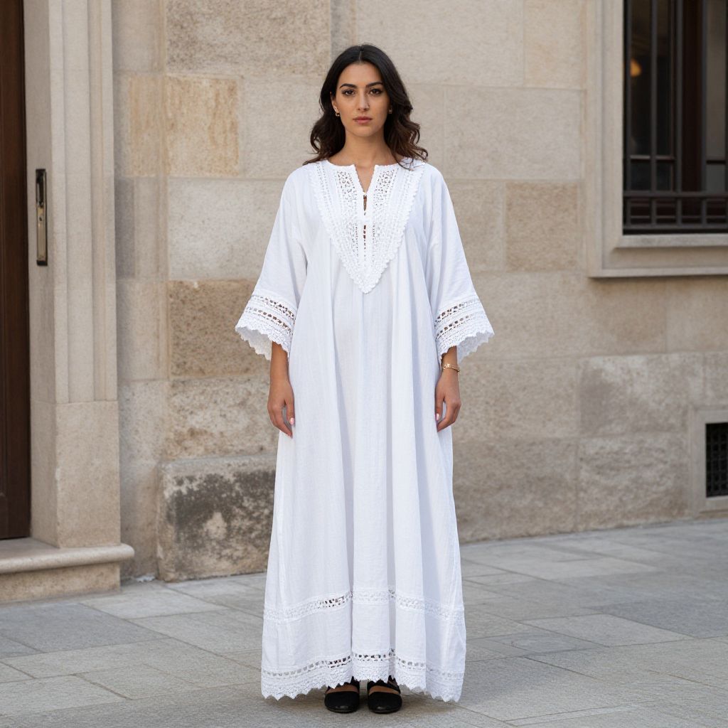Photograph of a young woman with medium-length, wavy dark hair standing against a beige stone building. She wears a long, white, loose-fitting dress with lace details on the sleeves and hem, and black shoes. Her expression is neutral, and she stands with her arms slightly away from her body. The background includes a stone wall with a door to the left and a window to the right, both with dark frames. The ground is paved with light gray tiles. The overall style is minimalist and modern.