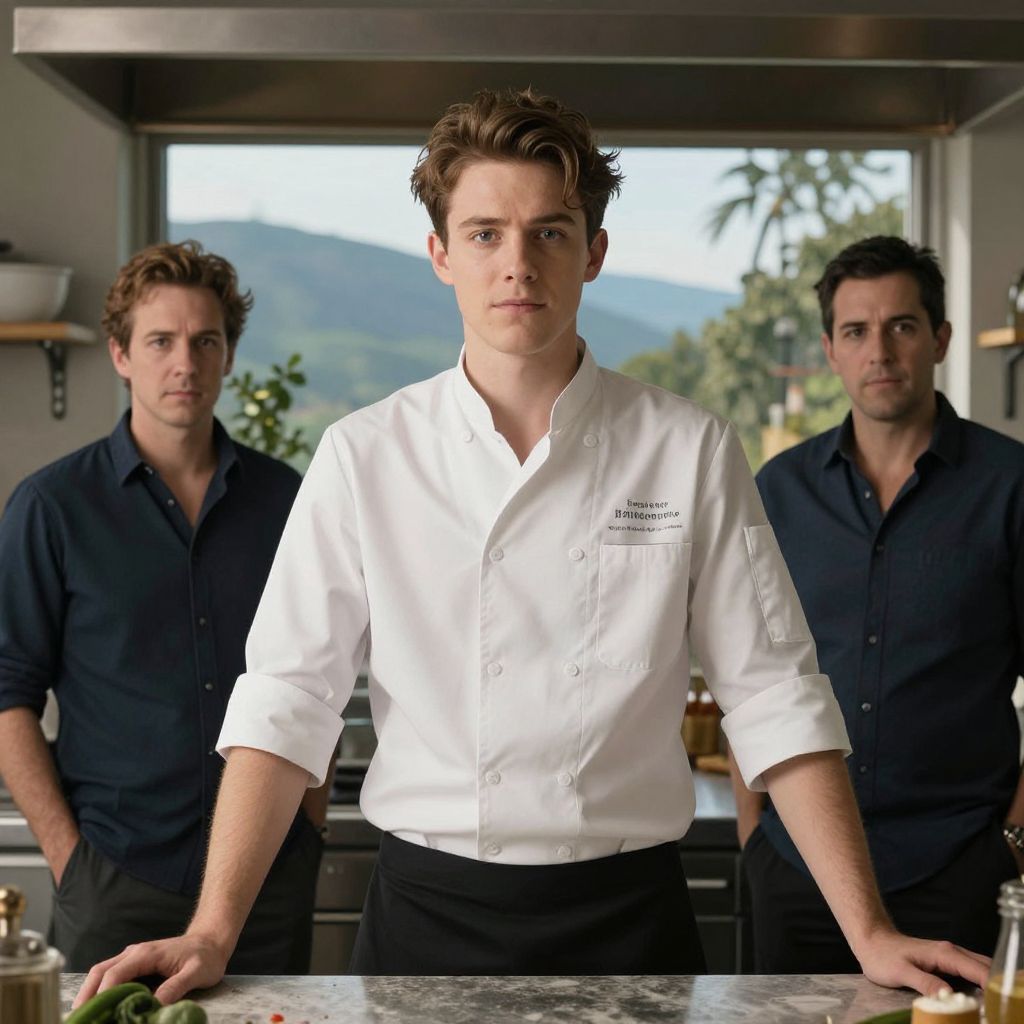 Photograph of a modern kitchen with three men standing behind a marble countertop. Central figure is a young, fair-skinned man with short brown hair, wearing a white chef's shirt with black pants, looking directly at the camera. Two men in dark blue shirts stand behind him, one on the left with curly brown hair, the other on the right with dark hair. Background includes a large window with a view of greenery and mountains, and stainless steel kitchen equipment. The lighting is natural, highlighting the clean, contemporary kitchen setting.