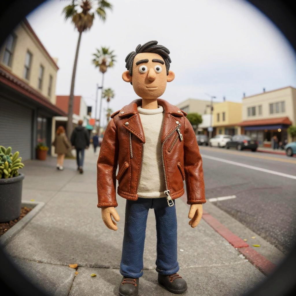 Realistic photo.Claymation Full body photo, street photography of a young man in the streets of Los Angeles wearing a leather jacket, hipster, real photography, low depth of field, full HD, shot on Kodak Portra 400 film, fisheye lens realistic photo