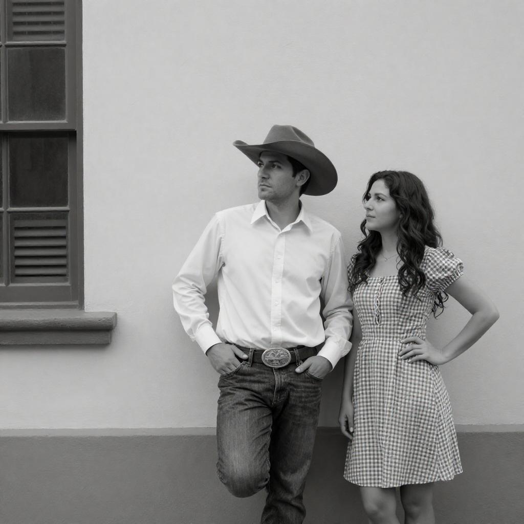 Black-and-white photograph of a man and woman standing in front of a ured wall. The man, wearing a cowboy hat, white shirt, and jeans, leans against the wall with one hand on his hip. The woman, in a checkered dress, stands beside him with one hand on her hip. Both look to the right. A window with a vent is on the left.