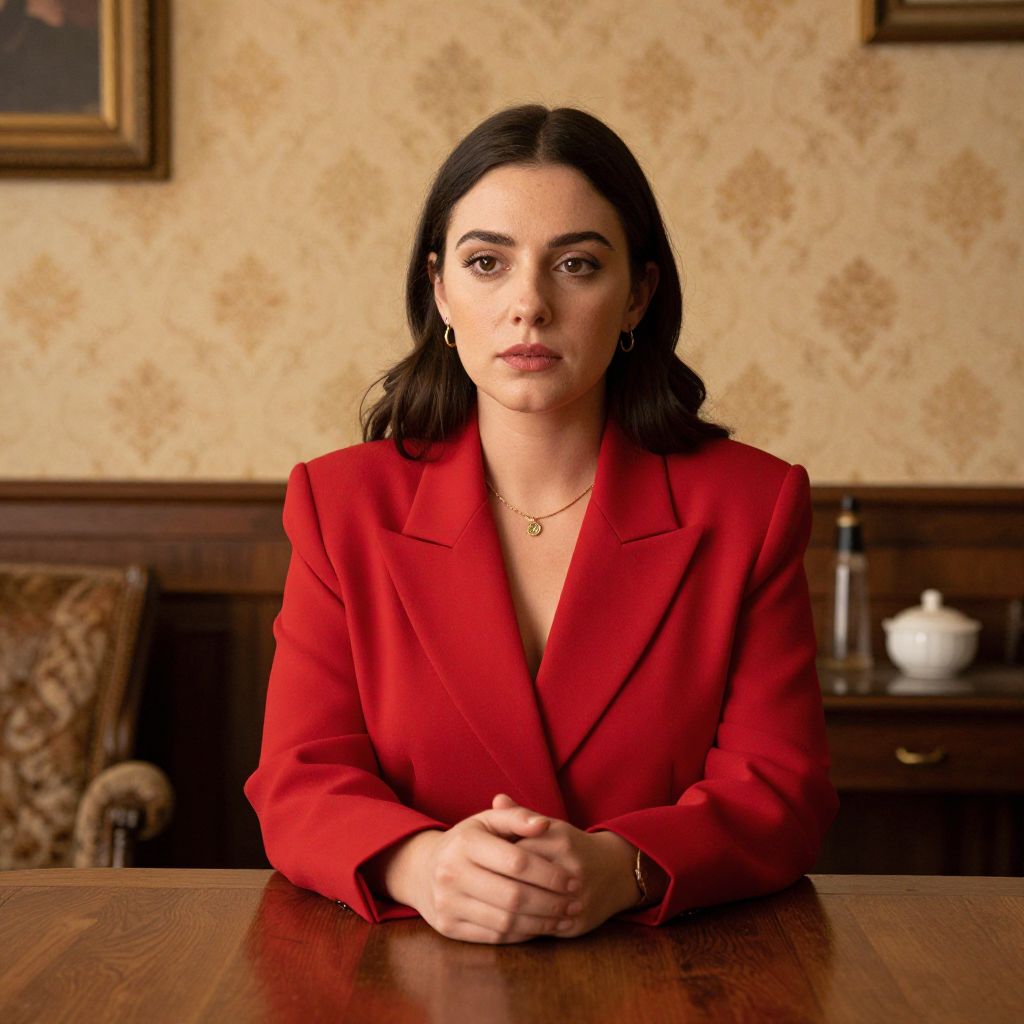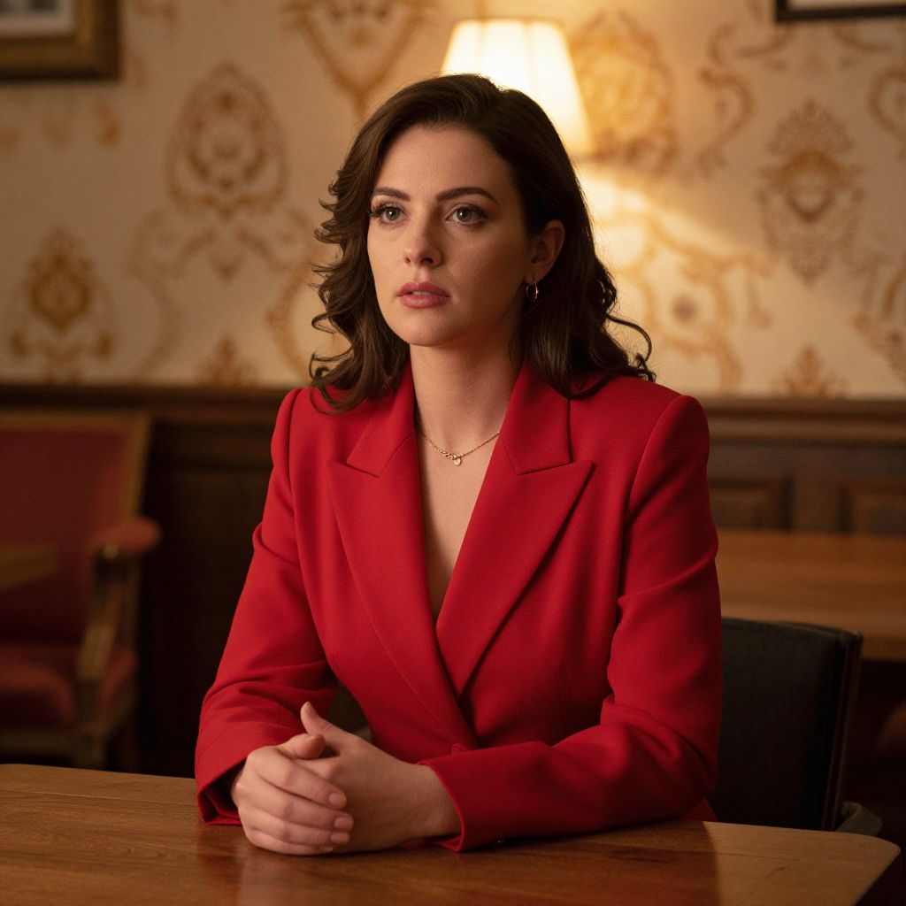 Woman in a vibrant red blazer sits poised at a wooden table, her hands delicately clasped as she gazes thoughtfully ahead, illuminated by warm lamplight against a backdrop of patterned wallpaper and vintage furnishings.