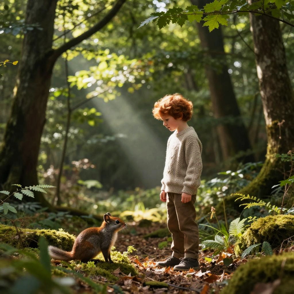 Photograph of a young boy with curly brown hair standing in a sunlit forest, wearing a beige knitted sweater, brown pants, and black shoes. He looks down at a small, brown squirrel sitting on the forest floor, looking up at him. The forest is dense with tall trees, green leaves, and sunlight filtering through the canopy, creating a dappled light effect on the ground covered in leaves and ferns. The boy stands slightly to the right of center, while the squirrel is on the left, near his feet. The background shows a serene, lush forest scene.