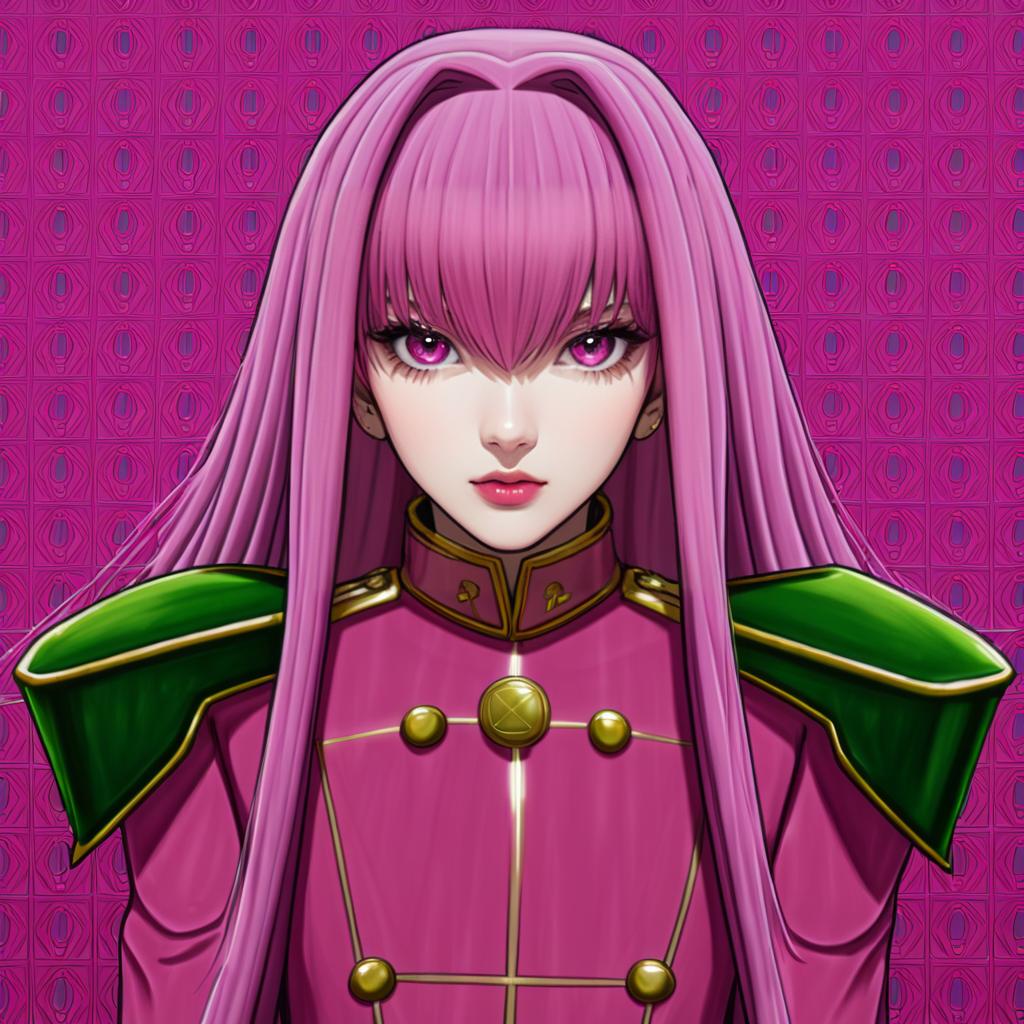 Anya alstreim, code geass, 1girl, red eyes, pink eyes, pink hair, knights of the round uniform, by artist machismo fuji, anime