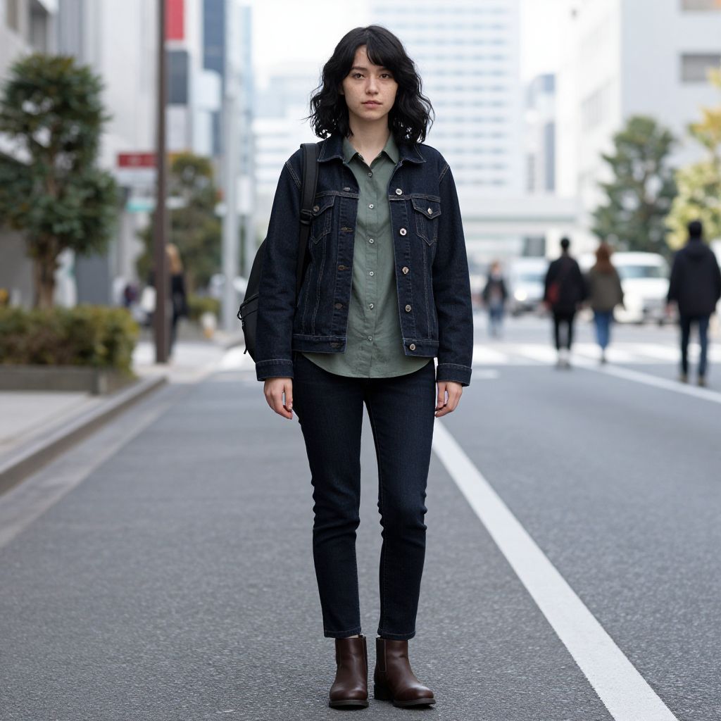 A woman in her late 20s with wavy black hair and subtle freckles stands in a stylish urban street in Yokohama, dressed in a modern yen press style look — dark denim jacket over a plain green shirt, dark skinny jeans, and brown ankle boots, with a backpack slung over one shoulder, city skyline in the background, natural daylight, detailed realism.