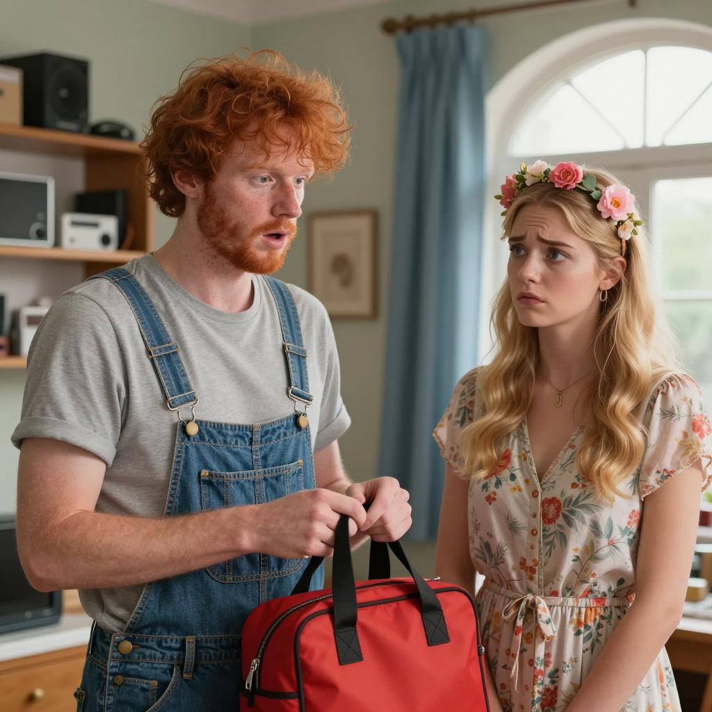 Red-haired man with messy hair, gray t-shirt, and denim overalls holding a red pack, surprised expression. Blonde woman with floral dress, pink headband, and flower crown, sad expression. Cluttered room with shelves, electronics, blue curtains, and arched window.