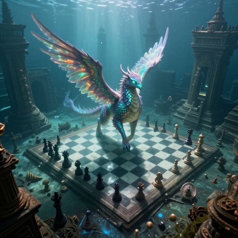A surreal dreamscape captures a majestic creature with iridescent scales and wings standing atop an expansive chessboard within an underwater temple. The ethereal presence of the creature casts an otherworldly glow across the scene, its luminescent eyes reflecting the mysterious artifacts scattered throughout the ancient ruins. From an aerial perspective, intricate details of the decaying architecture are highlighted, blending elements of mysticism and fantasy to evoke a sense of wonder and intrigue in viewers as they explore this enigmatic underwater sanctuary where reality bends and time stands still.