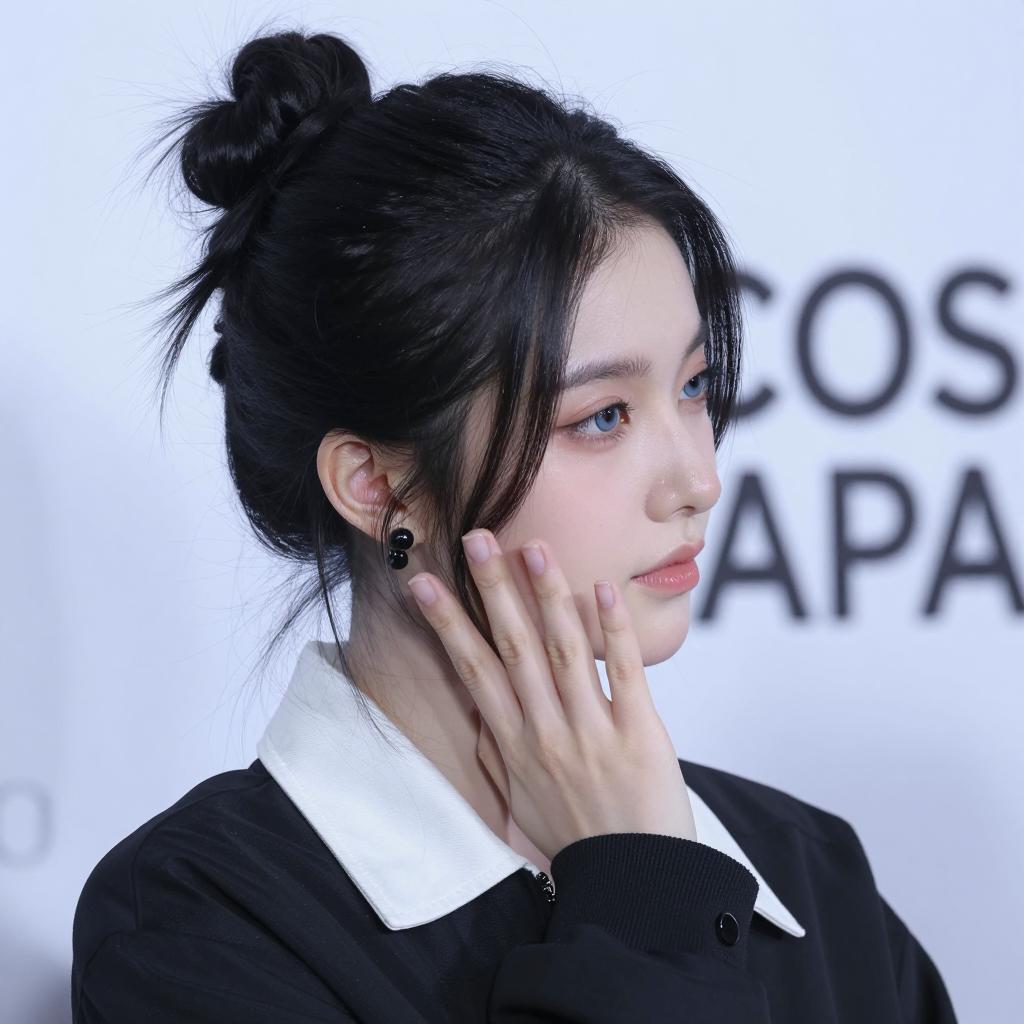 Photograph of an androgynous young person with pale skin and black hair in a high bun. They wear a black jacket with a white collar and black ear gauges. Their right hand touches their cheek, fingers forming a "V" shape. The background is blurred with light blue and white tones. Their profile is in sharp focus, showing a calm expression. Text "CROSS JAPAN" is in the background. The person has blue eyes. Upper body is visible.