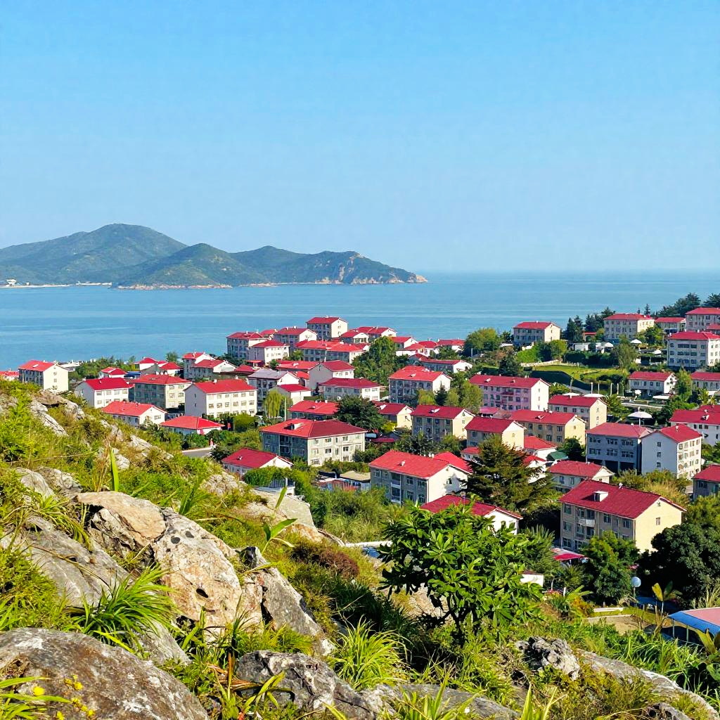 This photo shows a serene waterfront scene with a row of wooden stilt houses with red roofs floating over calm blue water. The background features hazy, purple-hued mountains under a pale sky. The houses are evenly spaced, and the water reflects the soft light, creating a peaceful, picturesque setting. The photo has a warm, slightly oversaturated color palette.