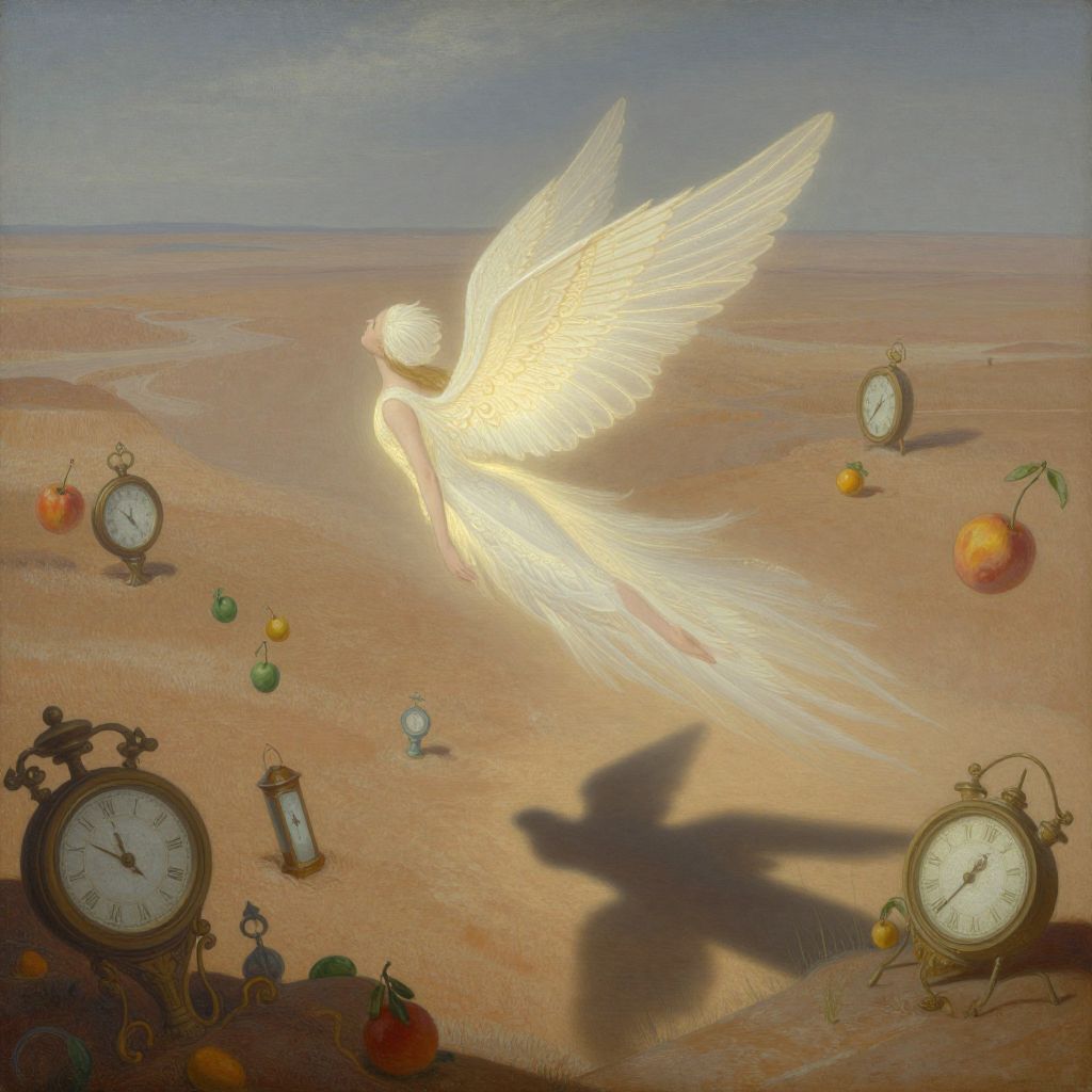 Surreal painting of a glowing white angel with wings flying over a desert, surrounded by clocks, apples, and shadow.