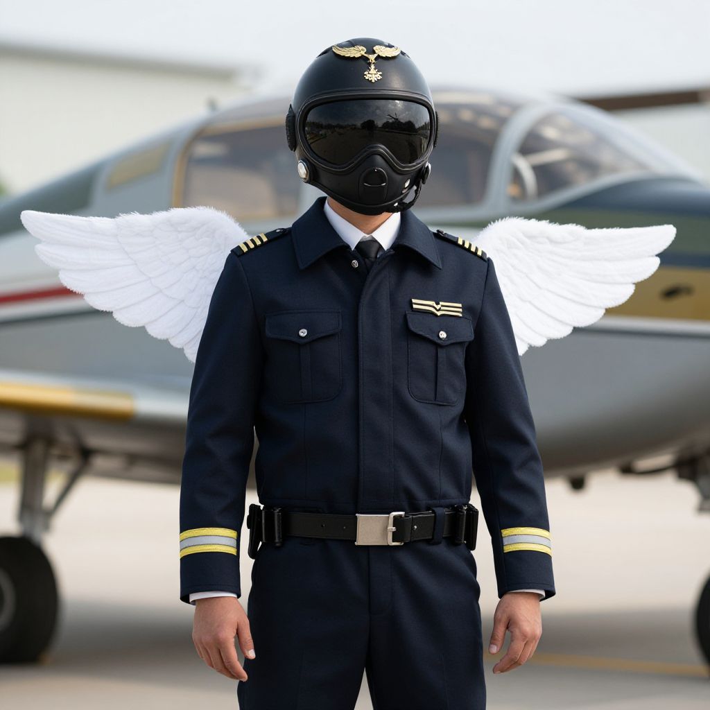 Photograph of a male pilot in a navy blue military uniform with gold stripes on the sleeves, black helmet with reflective visor, and black aviator mask. White angel wings are digitally added behind his shoulders. He stands in front of a blurred, silver military jet with yellow and red accents, visible on an airfield. The pilot's uniform includes a white shirt, black tie, and black belt with a silver buckle. His hands hang by his sides, and the overall image has a slightly surreal, digitally enhanced effect.