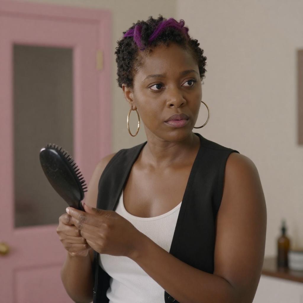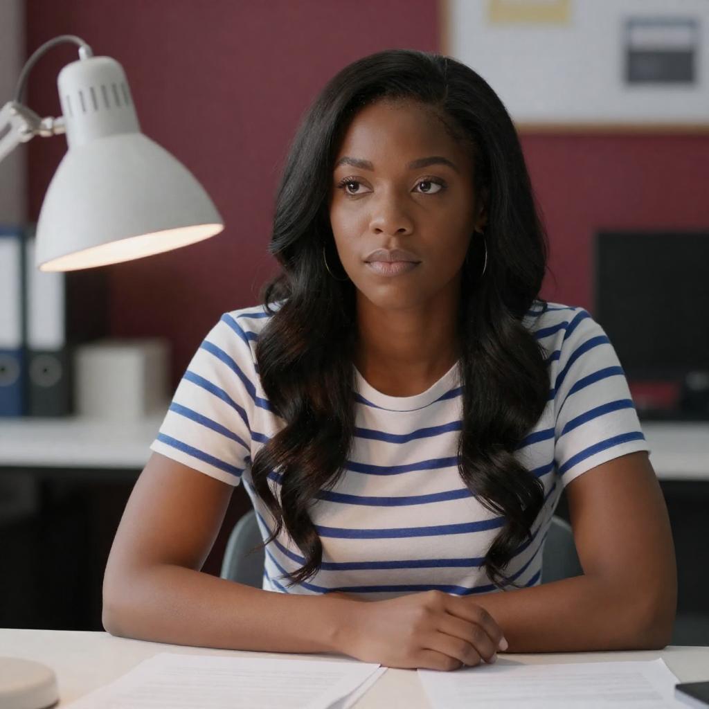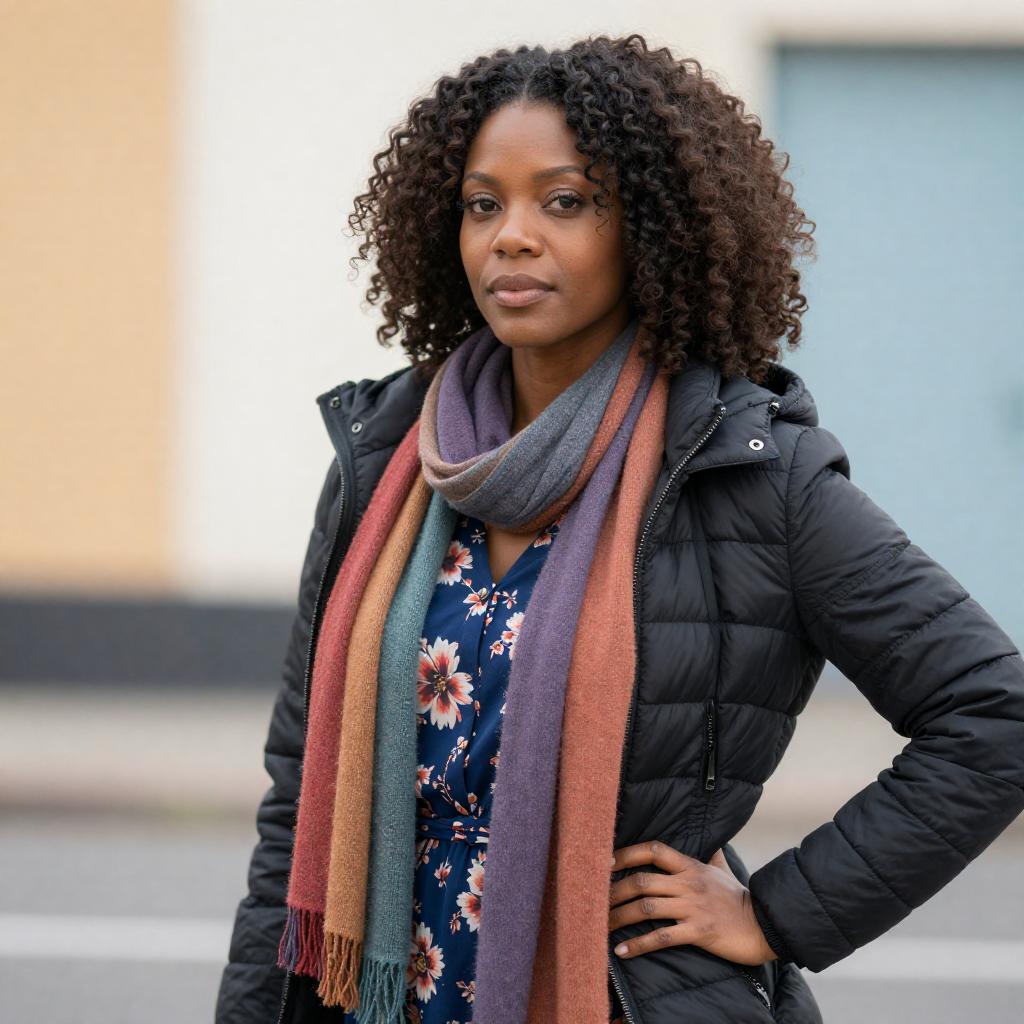 Photograph of a Black woman with curly hair, wearing a black puffer jacket, blue floral dress, and multicolored scarf. She stands with one hand on her hip, looking slightly to the side. Bright, blurred background with warm and cool light contrasts.