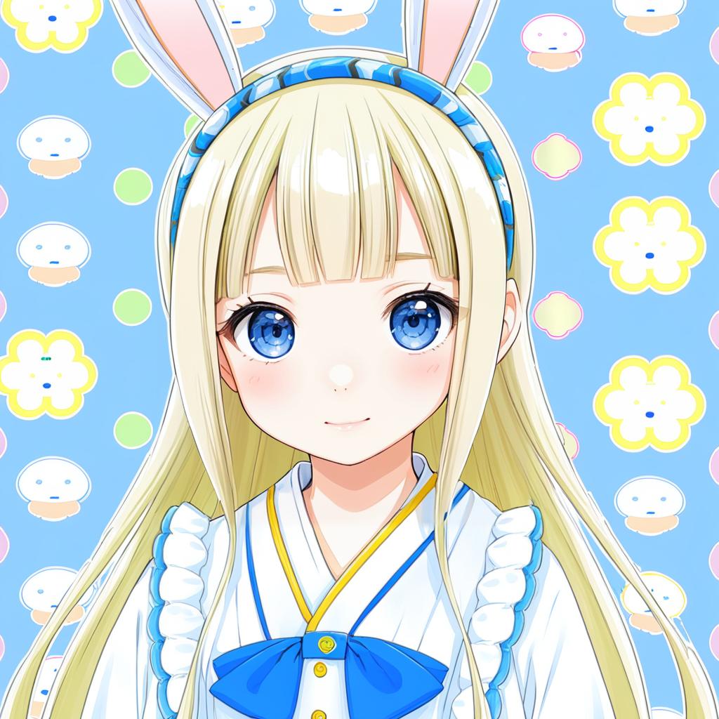 Illustration of an anime-style girl with long blonde hair and blue eyes, wearing rabbit ears attached to a blue and white hairband. She is dressed in a white and blue outfit with frilled sleeves and a large blue bow at the collar. The background features a playful pattern of colorful flowers and cute faces on a light blue backdrop.