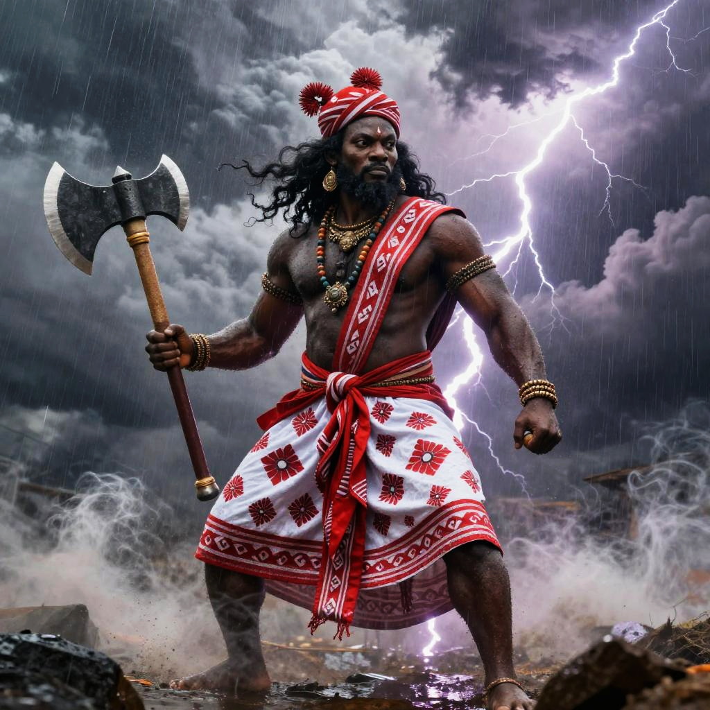 Pictures of Sango god of thunder, mighty African deity surrounded by swirling storm clouds and lightning bolts, traditional Yoruba attire with vibrant red and white patterns, holding a double-headed axe, dramatic sky and rain, powerful and majestic atmosphere