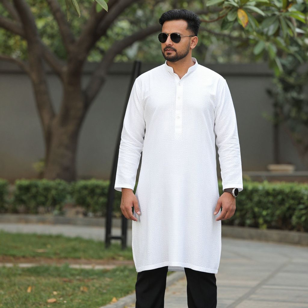 "Modern White Kurta, a man in a white shirt and black pants standing in a garden"