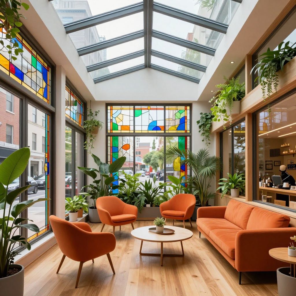 Bright and airy interior of a modern eco-house featuring large stained glass windows in vibrant colors. The space has a sloped glass ceiling, wooden floors, and walls lined with windows and lush green plants, creating a harmonious blend of nature and modern design. Furnished with bold orange chairs and sofa around a round coffee table, set in an urban downtown location inspired by Renzo Piano’s architectural style.