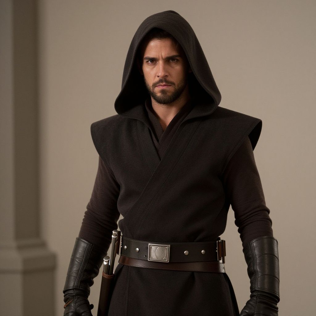 Jedi costume, male focus, 1boy, hood, realistic, facial hair, looking at viewer, gloves, indoors, solo focus, belt, weapon