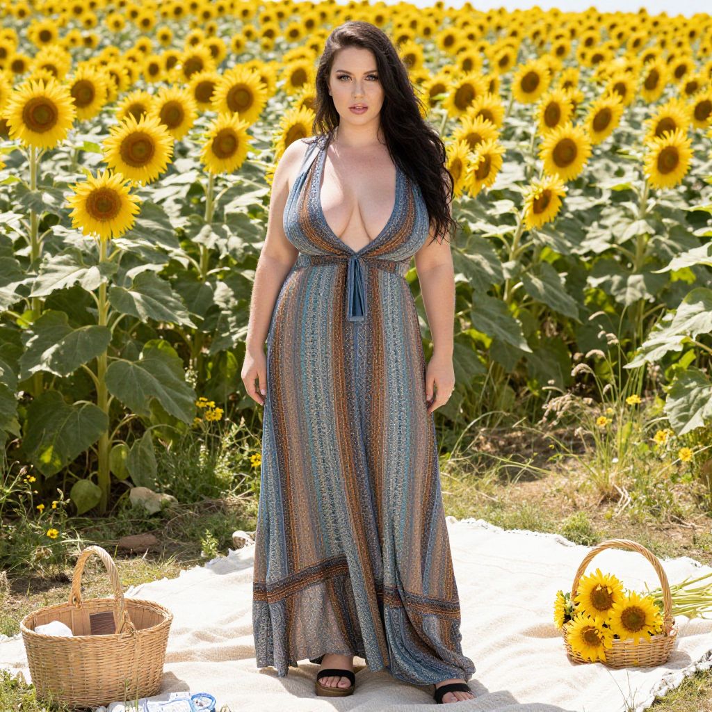 Photograph of a plus-sized woman with long, wavy black hair standing in a sunflower field. She wears a deep V-neck, sheer, blue and brown patterned maxi dress that reveals her cleavage. The background is filled with rows of bright yellow sunflowers. She stands on a white patch of ground with a woven basket and a single sunflower on the left and another sunflower on the right. The sunlight casts shadows, highlighting the textures of her dress and the sunflowers. The overall scene is vibrant and summery.