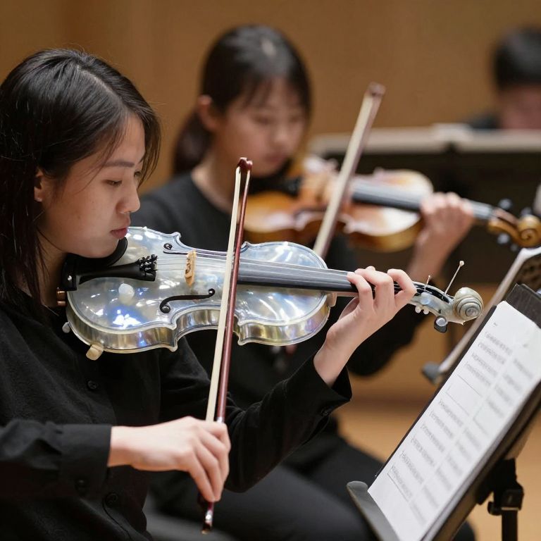 Photograph of three Asian female violinists playing in a concert hall. The closest woman, with straight black hair, wears a black long-sleeve shirt and focuses intently on her violin. Her instrument, with a glossy finish, reflects light. She holds a bow in her right hand. In the blurred background, two other women, also in black, play their violins. Music stands with sheet music are visible in front of each musician. The warm, brown-toned background contrasts with the white sheet music and black attire. The image captures a moment of concentration and musical harmony.