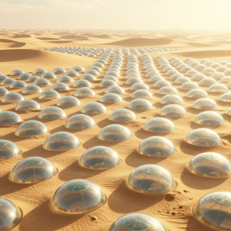 Photograph of a vast desert landscape with evenly spaced, transparent, reflective domes casting long shadows under a glowing, golden sunset.