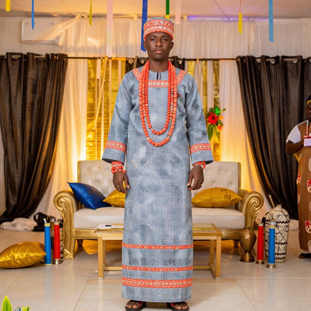 First outing Igbo traditional wedding attire in a modern interpretation, blending traditional coral beadwork and fabrics with contemporary styles, displayed in an elegant indoor ceremony filled with colorful decorations and traditional artifacts.