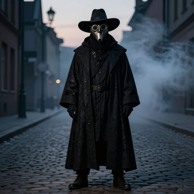 Plague doctor full body standing on a cobblestone street, twilight with smoky background, detailed mask with glass eye-pieces, wearing wide-brimmed hat, intricate patterns on cloak, cinematic composition, high contrast and dramatic atmosphere