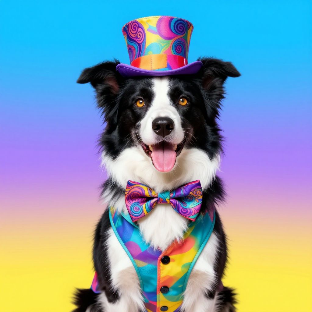 Digital artwork of a black and white Border Collie wearing a colorful, swirly-patterned top hat and bow tie. The dog also sports a matching, vibrant vest with buttons. The background is a gradient from blue at the top to yellow at the bottom. The dog has a happy expression with its tongue hanging out. The bright colors and whimsical accessories contrast with the dog's natural fur, creating a playful and eye-catching image. The textures are smooth, with a glossy finish on the hat and vest.